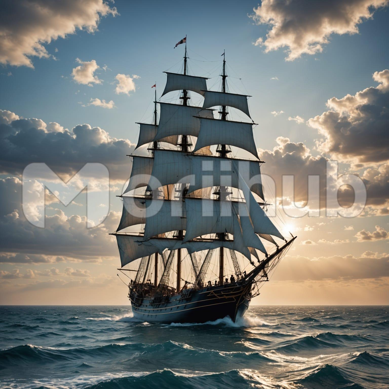 A ship sails steadily across the open sea, its sails billowing with quiet strength. The vessel cuts through the water with deliberate grace, leaving a faint trace behind. Above, clouds move in slow formation, their shapes shifting across the wide expanse. The horizon stretches without end, where the sea and sky appear to merge. The ship stands as a single, clear form within the vastness, defined by balance and motion. The scene holds a calm rhythm, both grounded and expansive in presence.