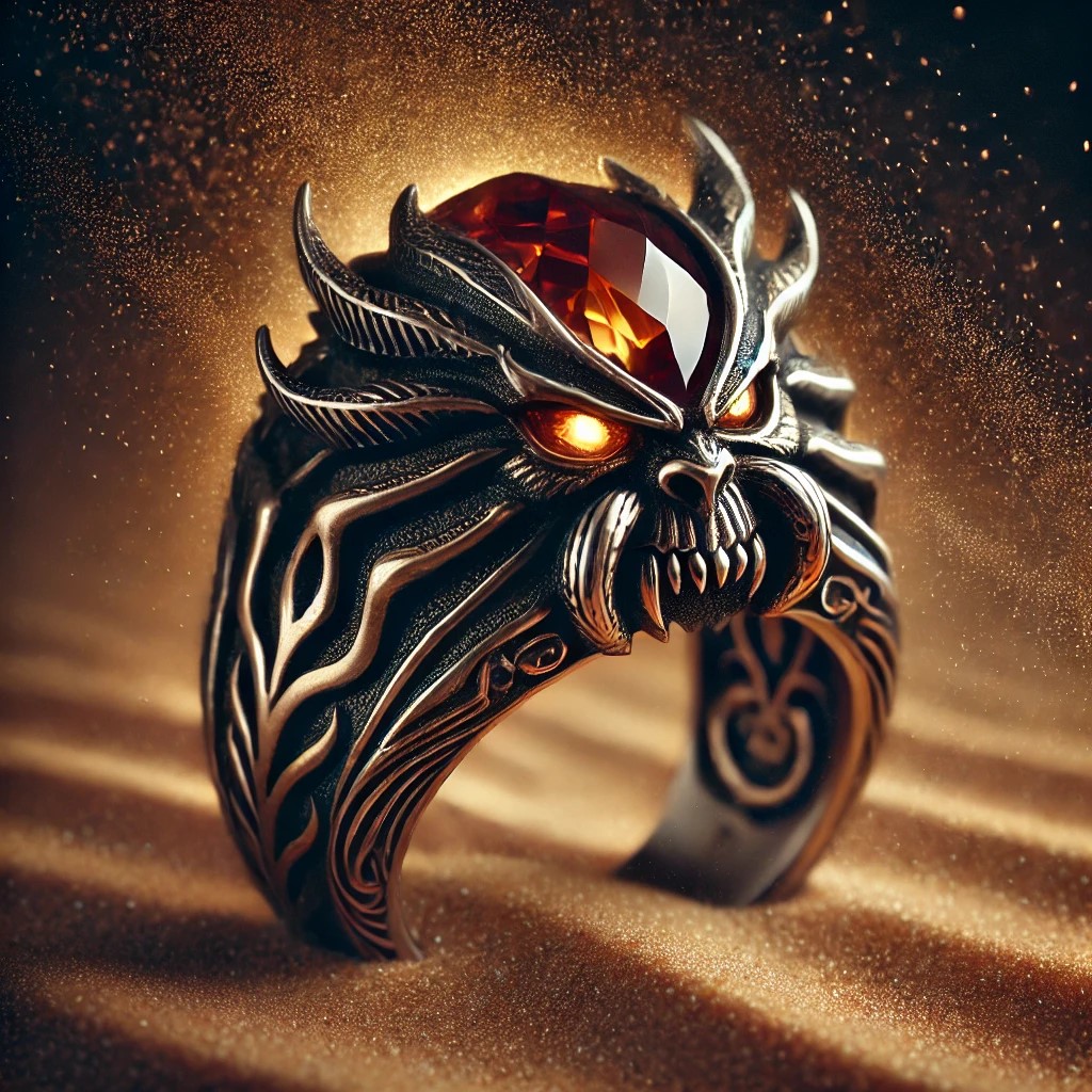 A mystical ring with a gemstone shaped like a demon’s head, crafted from swirling grains of sand. The demon’s eyes glow intensely, symbolizing danger and malevolence. The band is engraved with flame and claw patterns, representing chaos and power. A subtle sandstorm swirls around the ring, as if the demon’s spirit is alive, lurking through the desert.