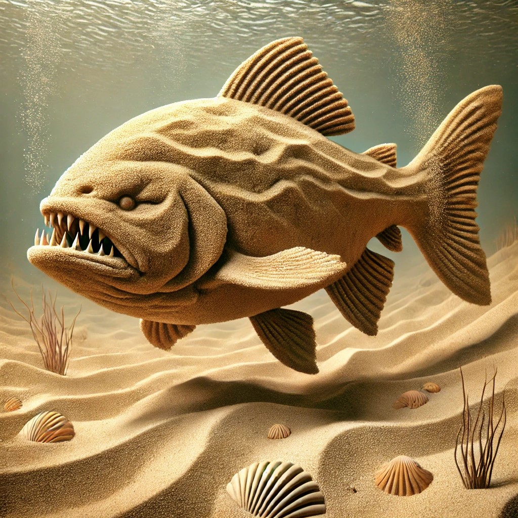 A desert-inspired scene featuring a sand piranha that embodies the essence of sand. The piranha has a grainy, textured surface, with scales that resemble shifting sand in warm shades of beige, tan, and golden brown. Its sharp teeth appear as if they’re carved from sandstone, and its fins and tail flow like dunes shaped by the wind. The piranha swims through a sandy, underwater environment with a seabed covered in rippled sand, scattered seashells, and submerged desert plants.