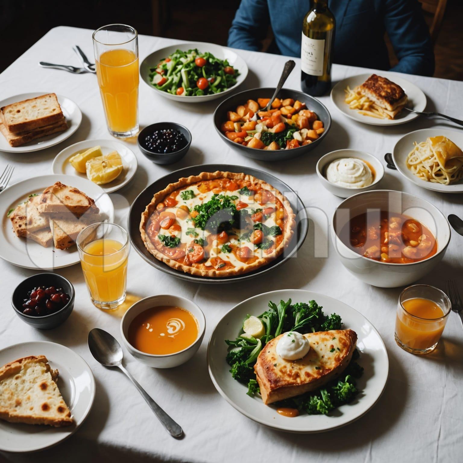 A variety of dishes are laid out across the table, creating a vibrant and tempting spread. The plates are arranged thoughtfully, each dish prepared with care and attention to detail. Aromas blend together, filling the air with an inviting warmth that calls for everyone to gather around. The setting feels cozy and relaxed, with the food becoming the centerpiece for connection and enjoyment. Each dish, rich in flavor and thoughtfully presented, adds to the ambiance, making it a perfect scene for sharing a memorable meal together.