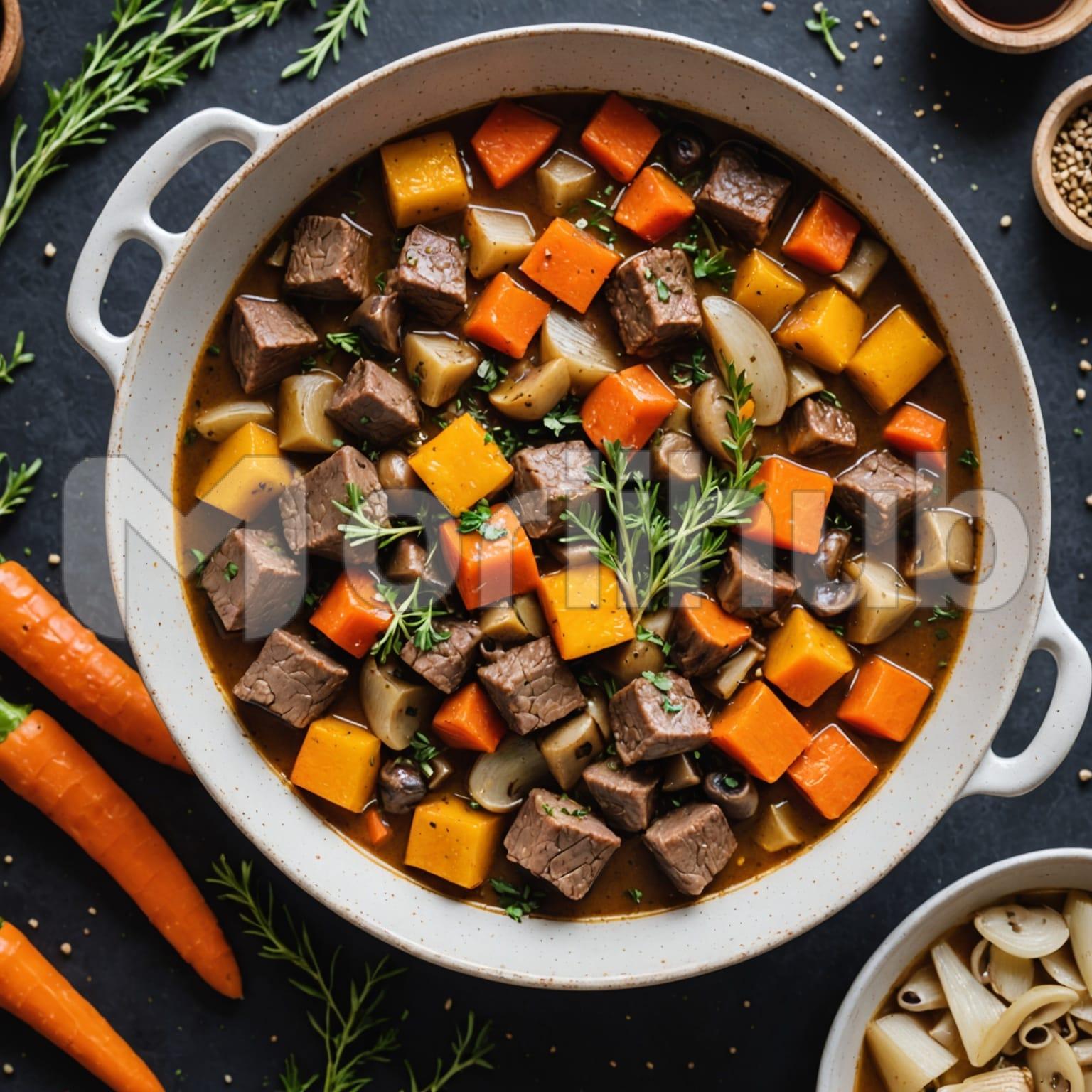 A comforting bowl of beef stew sits on the table, the rich broth filled with tender chunks of beef and diced carrots. The vegetables have absorbed the deep flavors of the stew, offering a slight sweetness alongside the savory beef. The broth is thick and hearty, adding to the dish’s warmth and satisfaction. The stew’s inviting aroma fills the air, creating a sense of coziness, perfect for a cold day. The simple, nourishing meal rests on the tabletop, ready to provide comfort and warmth.