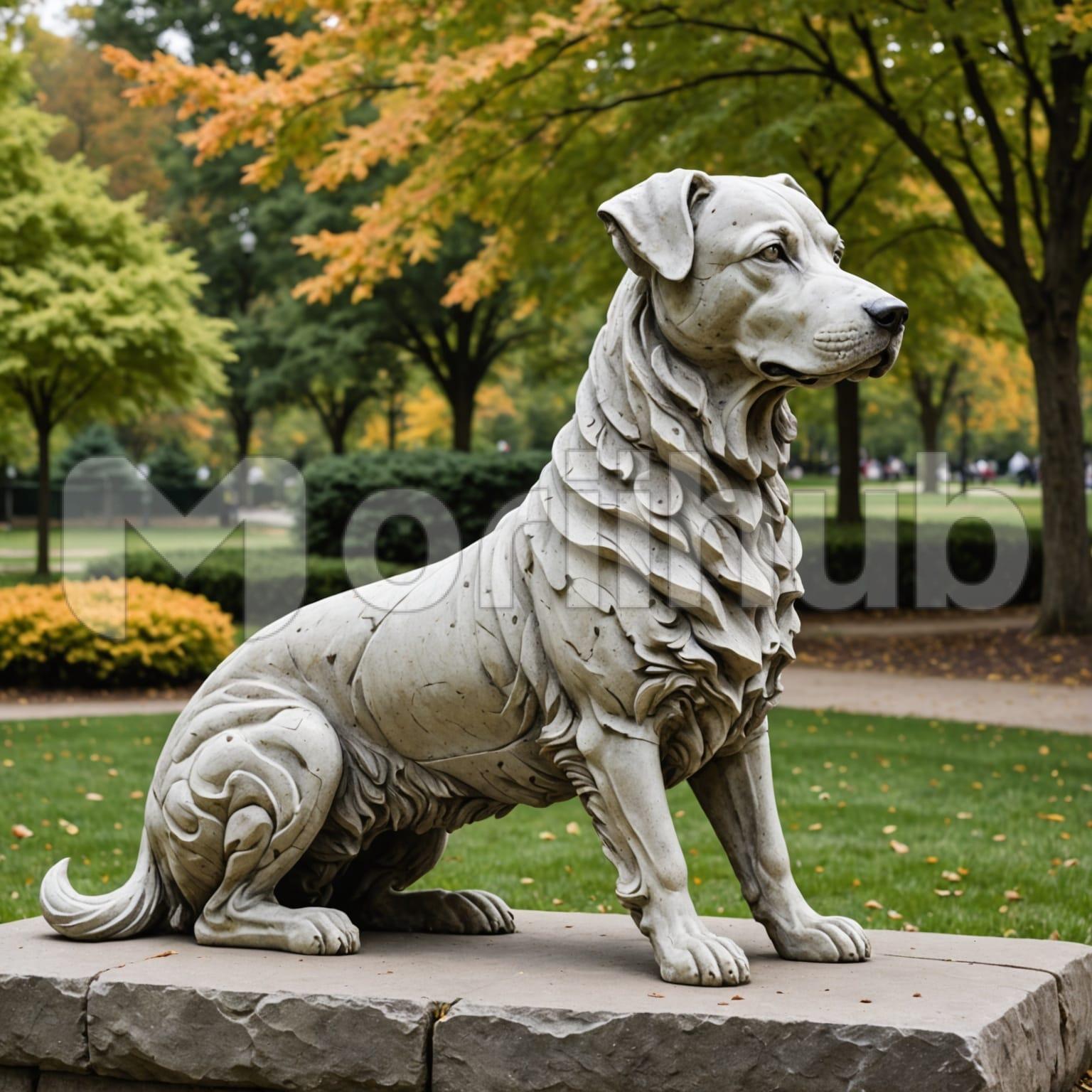 A stone sculpture of a dog sits firmly on a raised platform in a quiet park. The figure is upright, ears set back slightly, with a smooth surface and simple, defined features that give it a calm presence. Around the sculpture, the open space is clear, and in the distance, a line of trees marks the edge of the park. The trees rise gently, their trunks evenly spaced, providing a soft backdrop. The platform is solid, and blends well with the simplicity of the scene. Nothing distracts from the sculpture’s quiet focus.