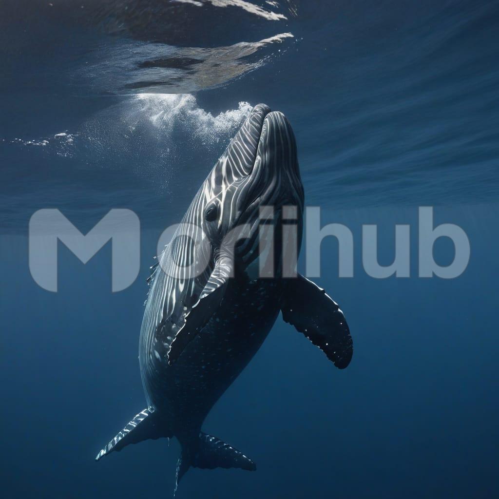 A giant whale dances gracefully on the sea, its massive tail splashing in rhythm with the waves. With fluid movements, it leaps and twirls, creating ripples across the ocean’s surface. The majestic creature performs an elegant ballet, embodying the freedom and beauty of the deep blue, captivating anyone who witnesses this natural spectacle.