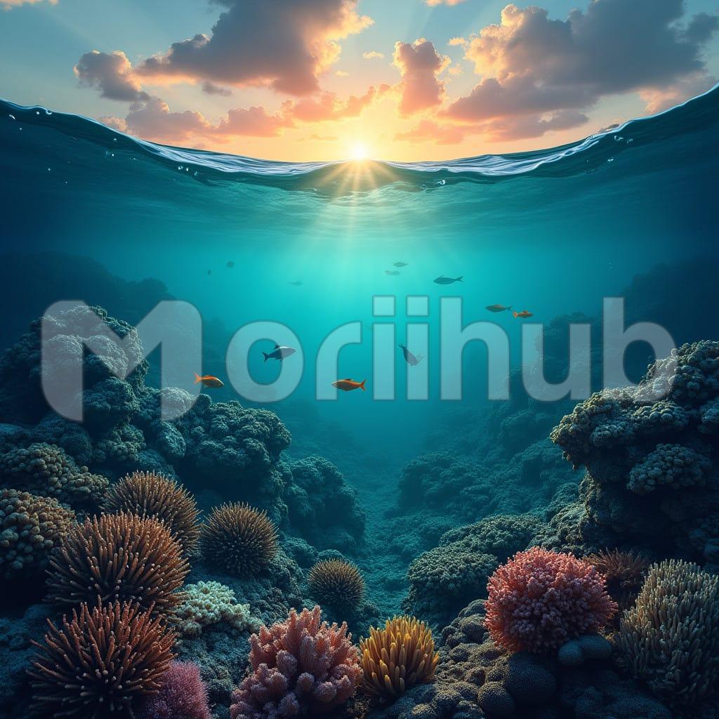 Sun rays pierce through the sky, cascading into the sea with a gentle brilliance, illuminating the underwater world below. The light dances on the surface and reaches the coral reefs, their intricate forms and textures faintly visible beneath the clear water. A couple of fish swim gracefully among the corals, their movements adding life to the serene scene. Above, wisps of clouds stretch lazily across the sky, completing the tranquil view. The blend of sea, sky, and marine life creates a harmonious and peaceful moment.
