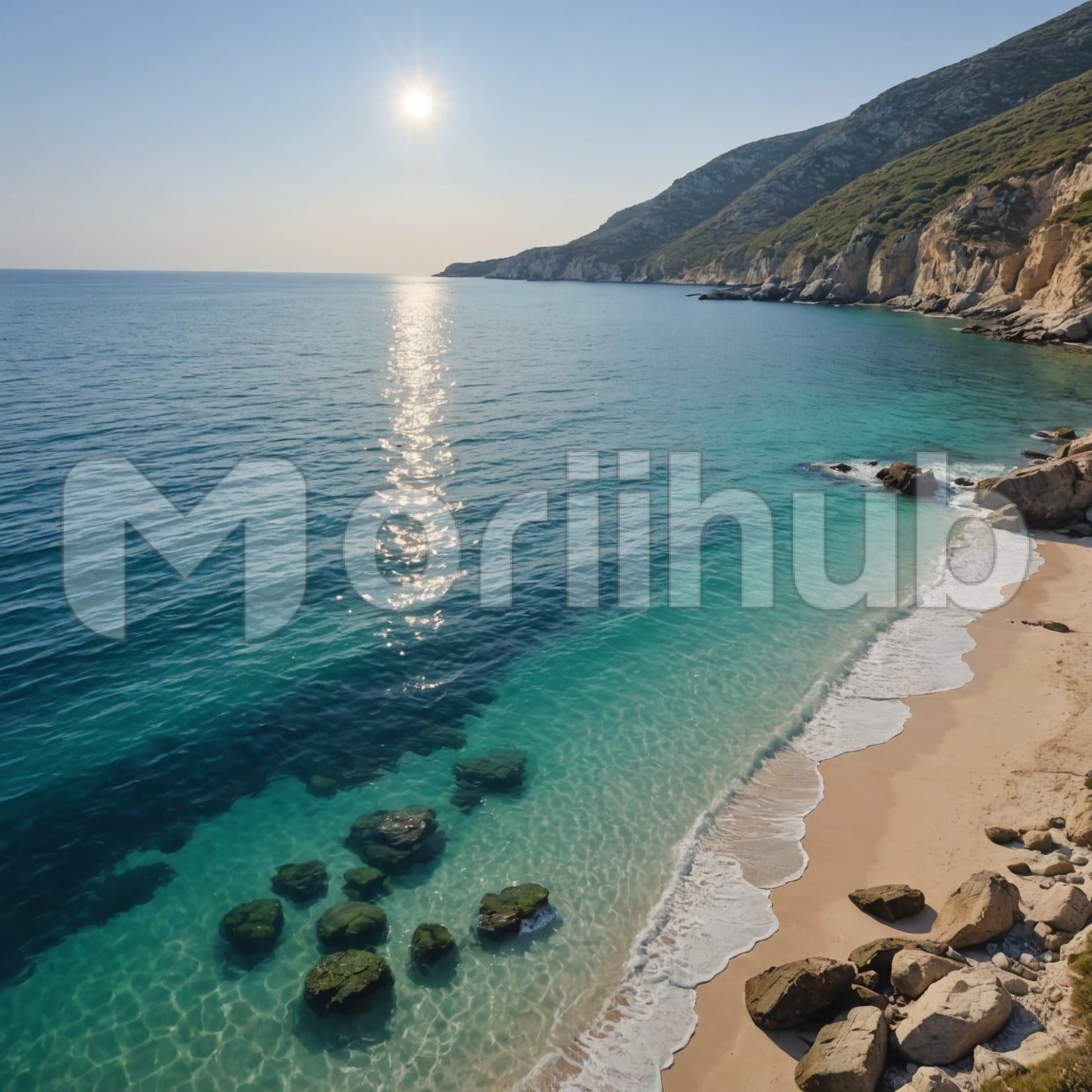 The calm sea stretches out endlessly, its surface smooth and tranquil under the clear sky. Gentle ripples create a peaceful rhythm as the water glistens in the sunlight. In the corner, a rocky cliff rises sharply, its jagged edges contrasting with the softness of the sea. The sun shines brightly overhead, its warmth casting a serene glow over the landscape. The air is fresh and crisp, and the entire scene exudes a quiet, soothing beauty, inviting calm and reflection.