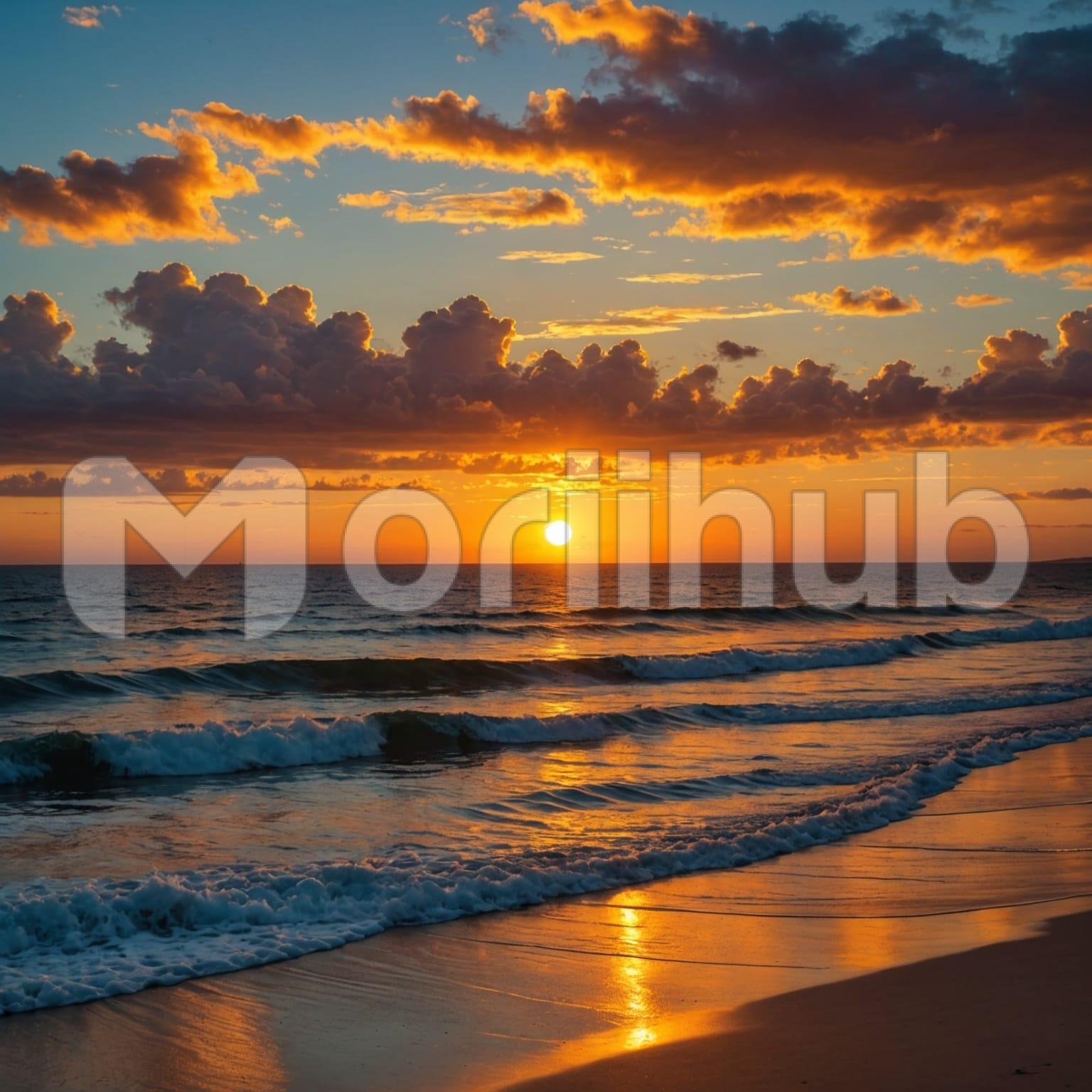 Waves roll gently toward the shore, their motion steady and unhurried. The water glistens under the fading light, reflecting subtle shifts in color. Along the horizon, the sun lowers, casting a soft glow that meets the sky. Wisps of clouds stretch above, delicate and drifting. The shoreline remains quiet, shaped by the rhythmic movement of the tide. Each wave leaves a fleeting trace before retreating, merging into the endless expanse of the sea. The scene captures a tranquil moment as day transitions into night.