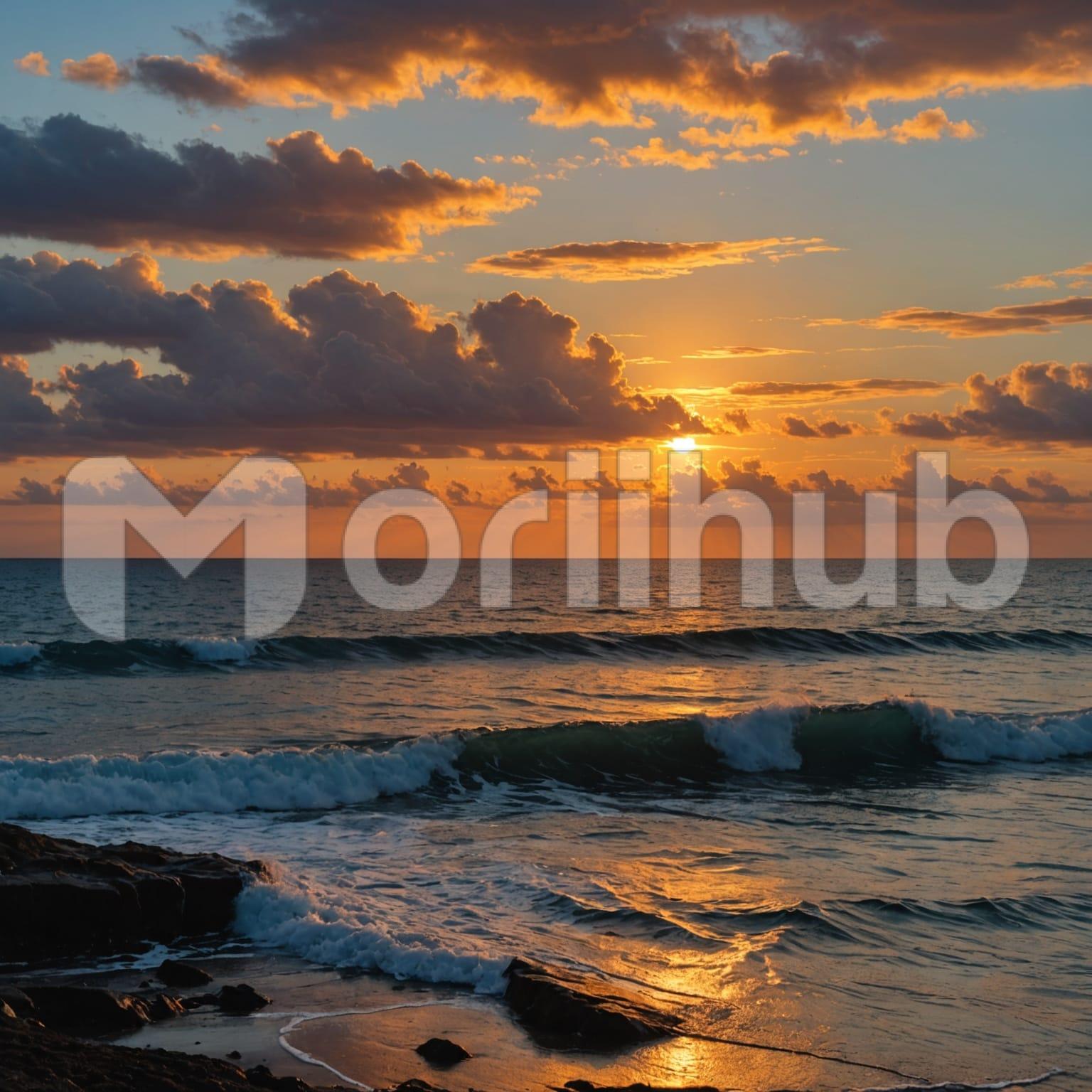 The sun sets slowly over the sea, its warm glow stretching across the horizon. The water mirrors the fading light, creating a peaceful surface. Wisps of clouds drift lazily in the sky, soft and fleeting as the day transitions into night. The air is still, and the rhythmic sound of waves gently breaks the silence. As the sun sinks lower, the scene becomes even more serene, a perfect moment of natural calm. The landscape is timeless, offering a quiet beauty.