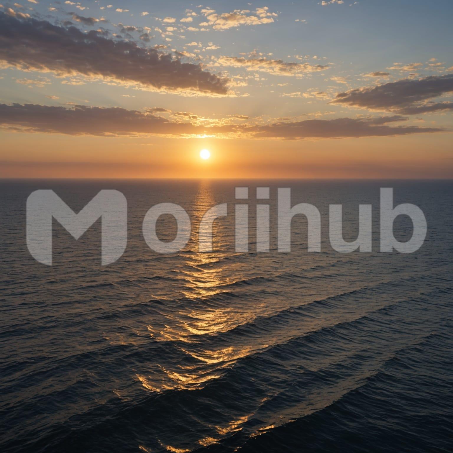 The ocean stretches far and calm, its surface moving gently with soft, steady waves. Above, clouds drift slowly across the sky as the sun lowers, casting a gentle light over the scene. The air feels peaceful, carrying the faint rhythm of the water’s motion. Each wave rises and falls in quiet harmony, reflecting the serenity of the moment. The horizon seems endless, where sky and sea blend as one. Time feels still here, wrapped in calm, as the day quietly fades away.