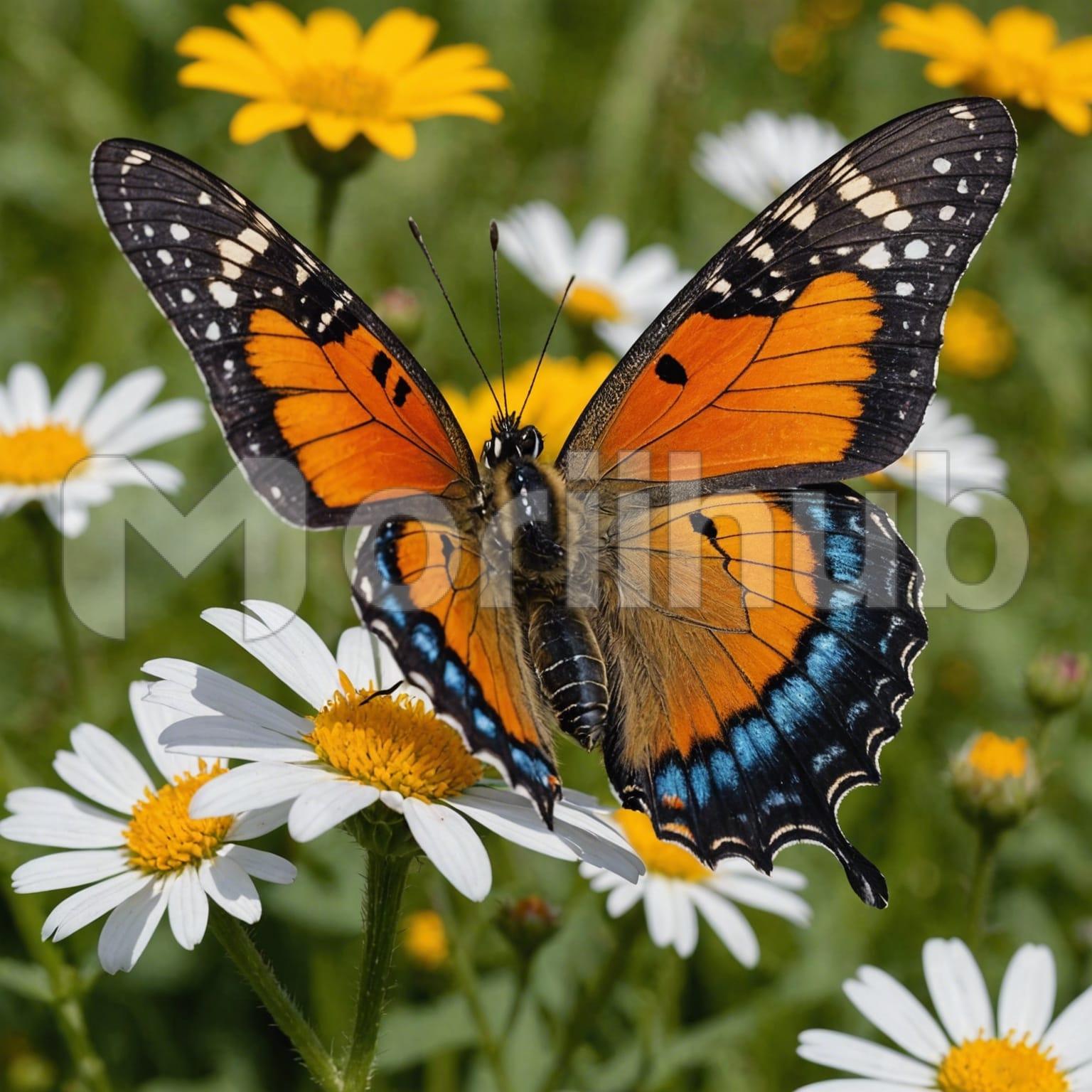 A butterfly delicately perches on a vibrant flower, its wings a kaleidoscope of colors. The gentle flutter of its wings contrasts with the stillness of the flower, creating a scene of natural harmony. The butterfly’s delicate legs grasp the flower’s petals as it sips nectar, its antennae twitching with each movement. The surrounding greenery enhances the beauty of this moment, a perfect blend of color and life. This serene interaction between the butterfly and the flower captures the essence of nature’s intricate and fleeting beauty.