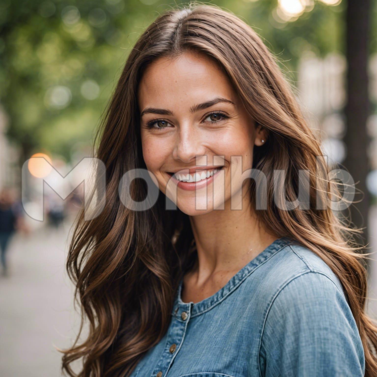 A stunning woman stands looking ahead, her smile radiating warmth and confidence. Her eyes sparkle with a lively gleam, complementing the gentle curve of her lips. The elegance of her features is enhanced by the natural grace she exudes, creating an aura of charm and poise. Soft waves of hair frame her face, adding to her allure. Her expression is one of serene joy and assurance, capturing a moment of pure, captivating beauty. This portrait of a woman combines elegance, confidence, and a vibrant, heartfelt smile.