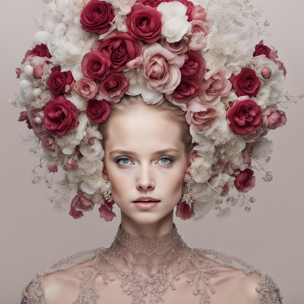 Against a simple backdrop, a model exudes ethereal charm, adorned with a large hat crafted from delicate petals. Her gaze is resolute and forward, capturing a moment of quiet contemplation. The floral crown atop her head adds a touch of whimsy, a harmonious blend of nature’s grace and high fashion. The plain background serves as a canvas, accentuating the model’s beauty and the captivating allure of the petal hat, creating an image that resonates with timeless elegance and natural mystique.