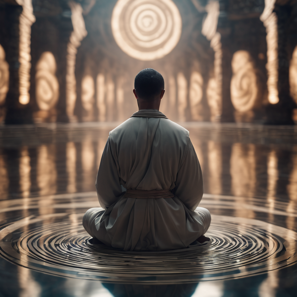 In the hushed confines of the hall, a man sits in serene meditation, his back to the world. Bathed in gentle light, his silhouette is a picture of tranquility, his posture upright yet relaxed. With eyes closed and hands resting on his knees, he delves deep into the realm of inner calm. The hall’s quiet ambiance enhances the sense of introspection, enveloping him in a cocoon of peaceful solitude amidst the bustling world outside.