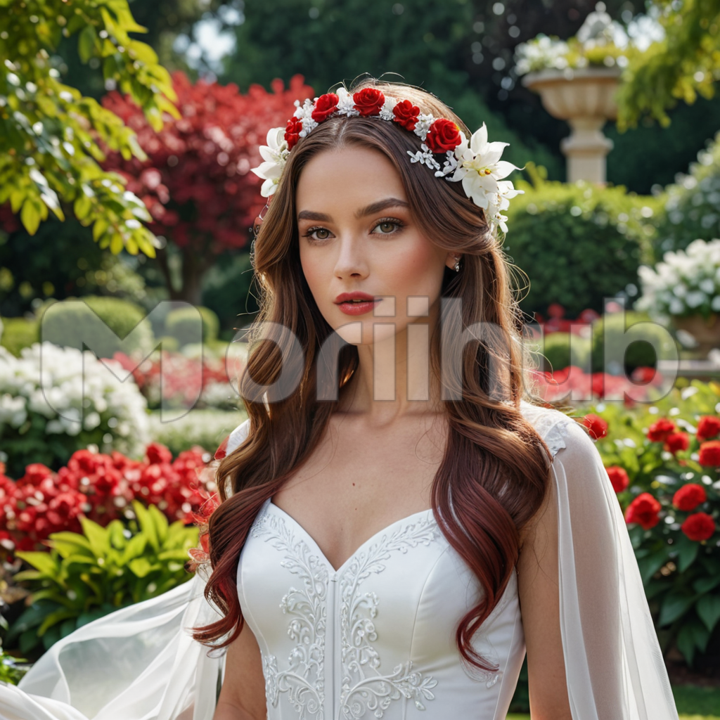 With a serene countenance, a woman stands amidst nature’s embrace, her gaze fixed upon the horizon. Adorned with a delicate floral laurel in her hair, she exudes an aura of natural beauty and grace. Against the backdrop of verdant foliage and azure skies, she embodies a harmonious connection with the world around her. In her gaze lies a sense of quiet contemplation, as she embraces the tranquility of the moment with poise and elegance.