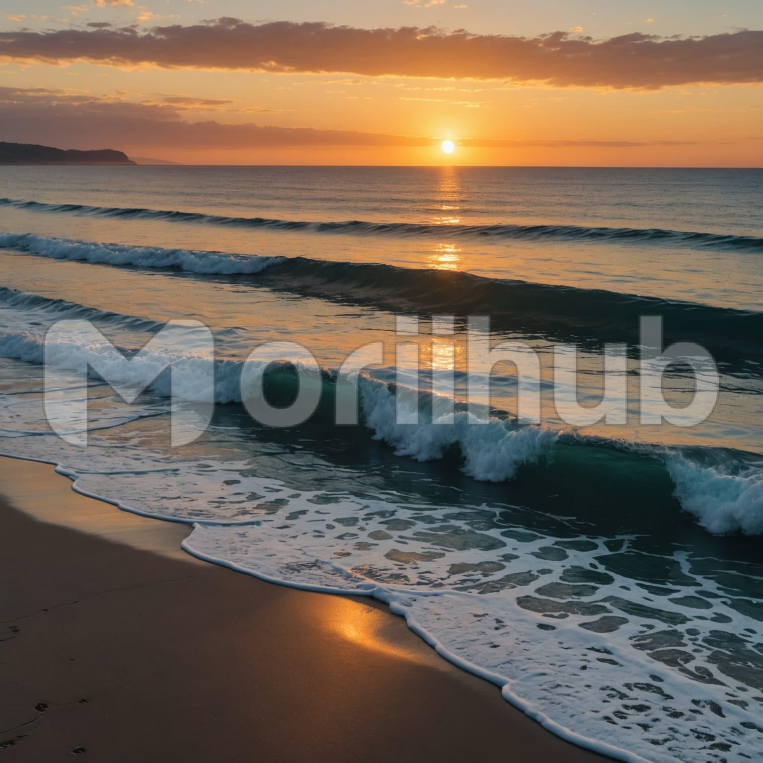 Waves move in a steady rhythm, washing over the shore before retreating, leaving behind a glistening trace. The tide shifts gently, its motion unbroken, shaping the sand with each return. On the horizon, the setting sun casts a soft glow, its light reflecting across the water’s surface. Wisps of clouds drift above, their delicate forms stretching across the sky. The colors of day fade gradually, blending into the deepening hues of evening. The scene remains quiet and unhurried, shaped by the endless movement of water and shifting light.