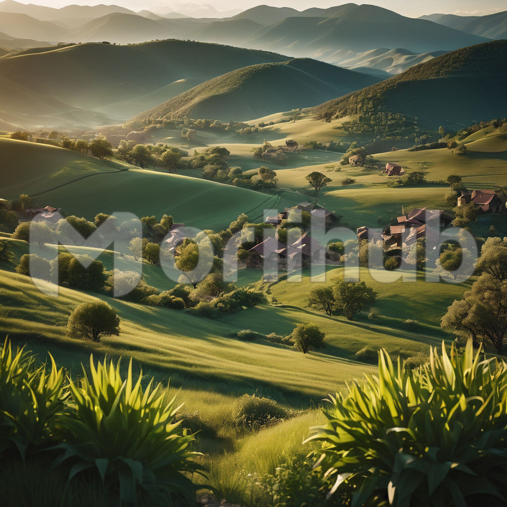 In the vast expanse of the field, shrubs speckle the landscape like patches of emerald. Their verdant leaves sway gently in the breeze, a testament to the rhythm of nature. Beyond, rolling hills rise and fall in undulating waves, their lush greenery a testament to the fertile earth. Underneath the vast sky, the scene is a symphony of tranquility, where the harmony of shrubs and hills paints a picture of serene beauty.