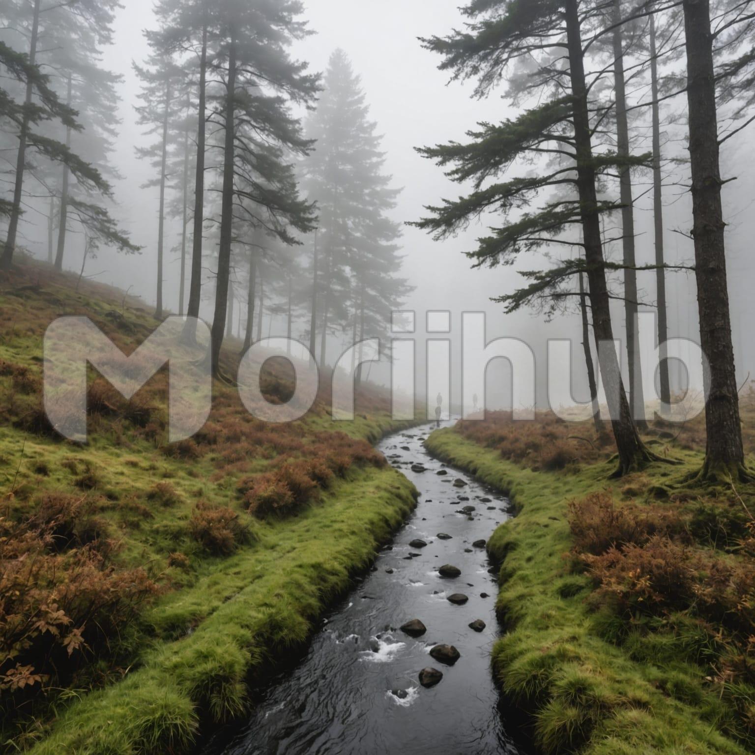 A gentle stream flows through the landscape, its surface glistening as it moves over rocks and ripples softly. On either side, a couple of trees stand tall, their branches reaching out, providing shade and a sense of quiet enclosure. Ahead, a soft mist rises, partially veiling the path of the stream and creating an ethereal atmosphere. The sound of the water flowing is calming, blending with the stillness of the trees and the soft, diffused light. The scene feels serene, untouched by time.