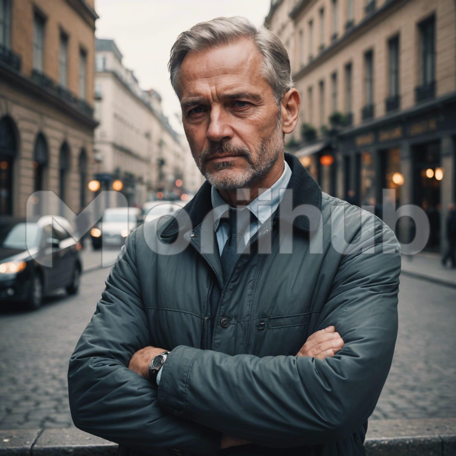 A man stands on the sidewalk, his gaze fixed on the horizon, lost in thought. Arms tightly crossed over his chest, a silent barrier against the world. His posture exudes confidence tinged with a hint of defiance, as if daring the world to challenge him. Despite the bustling street around him, he remains still, a solitary figure in the flow of humanity. His expression is unreadable, a mask hiding his inner turmoil or perhaps simply his determination to face whatever comes his way.