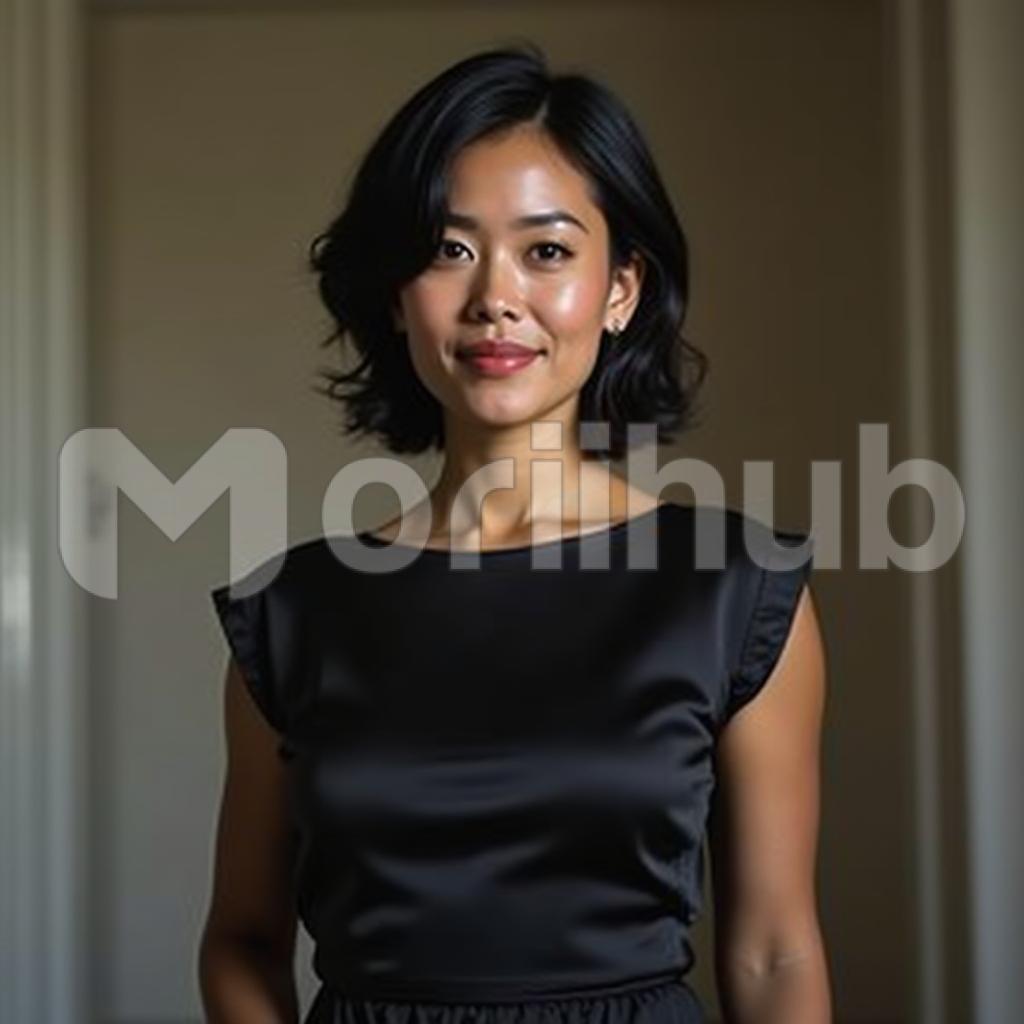 A woman stands confidently, facing forward, her gaze steady and poised. She wears a sleek, black silk gown that drapes elegantly over her form, catching subtle light in its smooth texture. Her short hair, neatly styled, frames her face, adding to her air of sophistication. The simplicity of the background, devoid of any distractions, enhances the focus on her presence and the refined elegance of her attire. With a calm, resolute expression, she exudes grace and strength, embodying a timeless beauty.