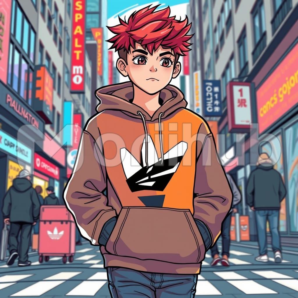A cartoon portrayal shows a boy in a hoodie, the hood resting against his back. His expression is neutral, and his posture is upright as he walks. The style is clean, with defined outlines and smooth shading that gives him a lively, approachable appearance. His hair is short and slightly tousled, adding to his casual look. The perspective follows his stride, capturing a sense of forward motion while keeping the focus on his relaxed demeanor and simple attire.