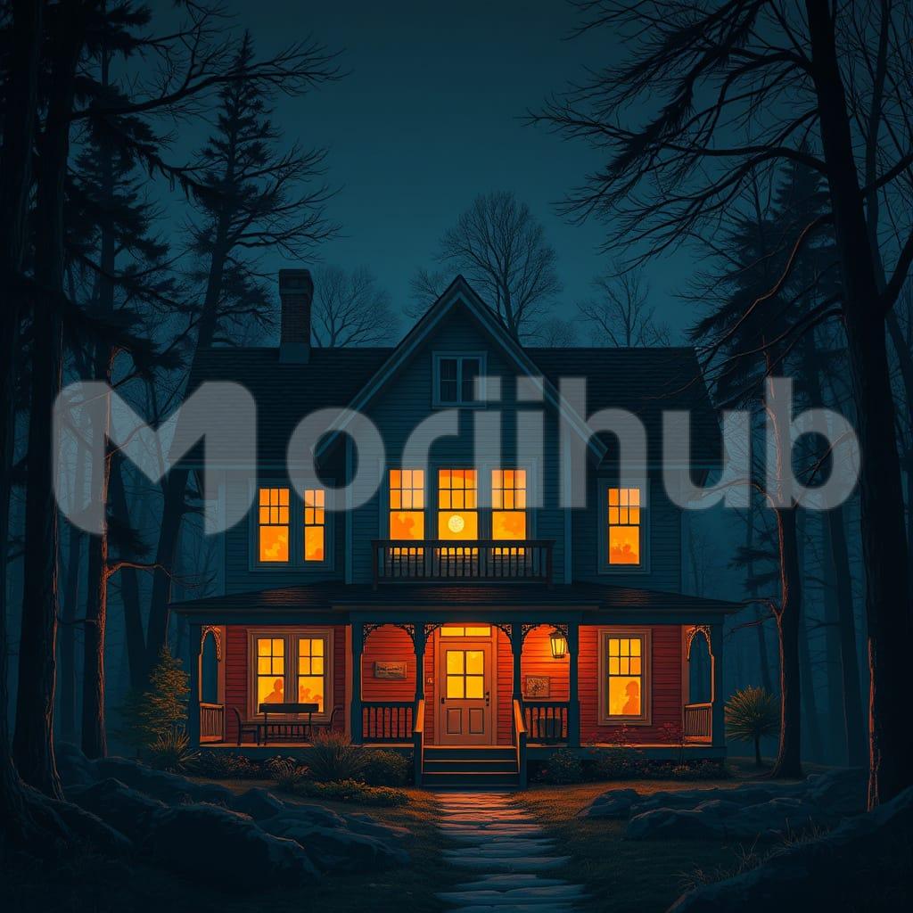 A house stands quietly surrounded by tall trees, their bare branches stretching upward. Soft light shines steadily from the windows, hinting at life inside without revealing details. The house is simple in shape, with a sloped roof and clear outlines. Trees encircle the structure, creating a natural frame. The warm glow inside contrasts with the stillness outside, giving the scene a sense of calm and solitude. The house appears safe and inviting, embraced by the quiet presence of the surrounding woods.