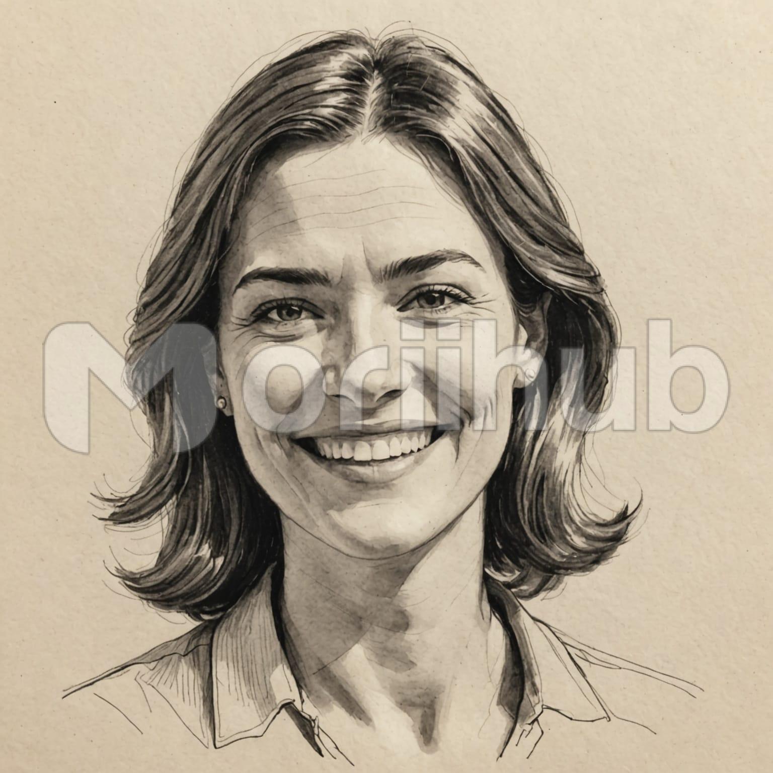 A sketch reveals a woman drawn with measured lines, her figure shaped with balance and restraint. Her gaze is directed outward, suggesting focus beyond the frame, while her lips are lifted into a smile that softens the composition. Shading is applied sparingly, lending dimension to her face and subtlety to her expression. Her hair, suggested through fluid strokes, frames her features without excess detail. The simplicity of the sketch allows the mood to remain clear, a study in presence conveyed with deliberate and understated marks.