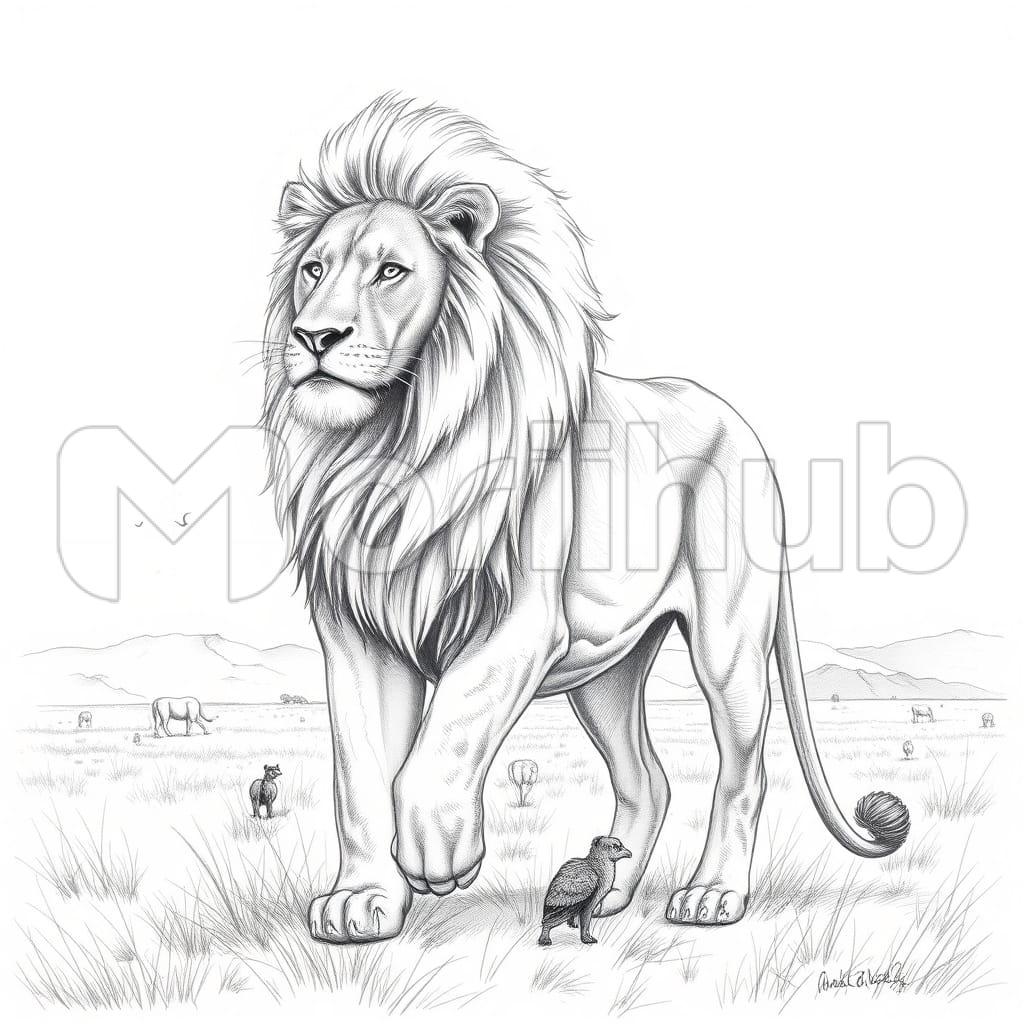 A sketch shows a lion walking forward, outlined with steady, clear lines. Its head is held upright, with a calm expression drawn simply. The mane flows back in smooth strokes, following the direction of its movement. Legs are placed in a natural stride, one lifted slightly as it moves ahead. The tail curves gently behind, balancing the figure. There are no added details around it, keeping full attention on the lion’s shape. The drawing stays simple and clean, capturing the quiet strength and steady motion of the walking lion in a focused way.