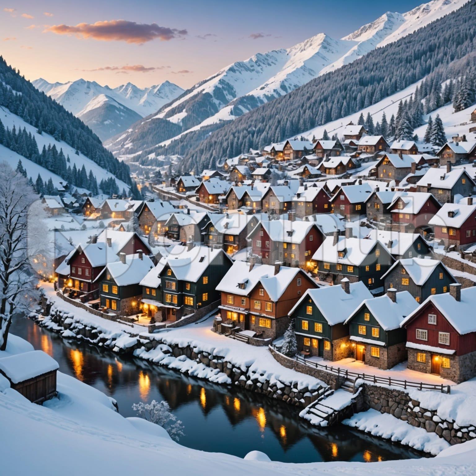A wintry town stretches quietly, its buildings lined in stillness, each roof carrying a layer of snow. The river in front runs steady, its surface edged with frost where water meets stone. Beyond, mountains rise, their slopes dressed in white, standing tall against the pale sky. The scene holds a balance of cold and calm, with the town resting near the river’s path while the mountains keep watch ahead. Snow softens the edges, leaving the view clear, steady, and hushed in presence.