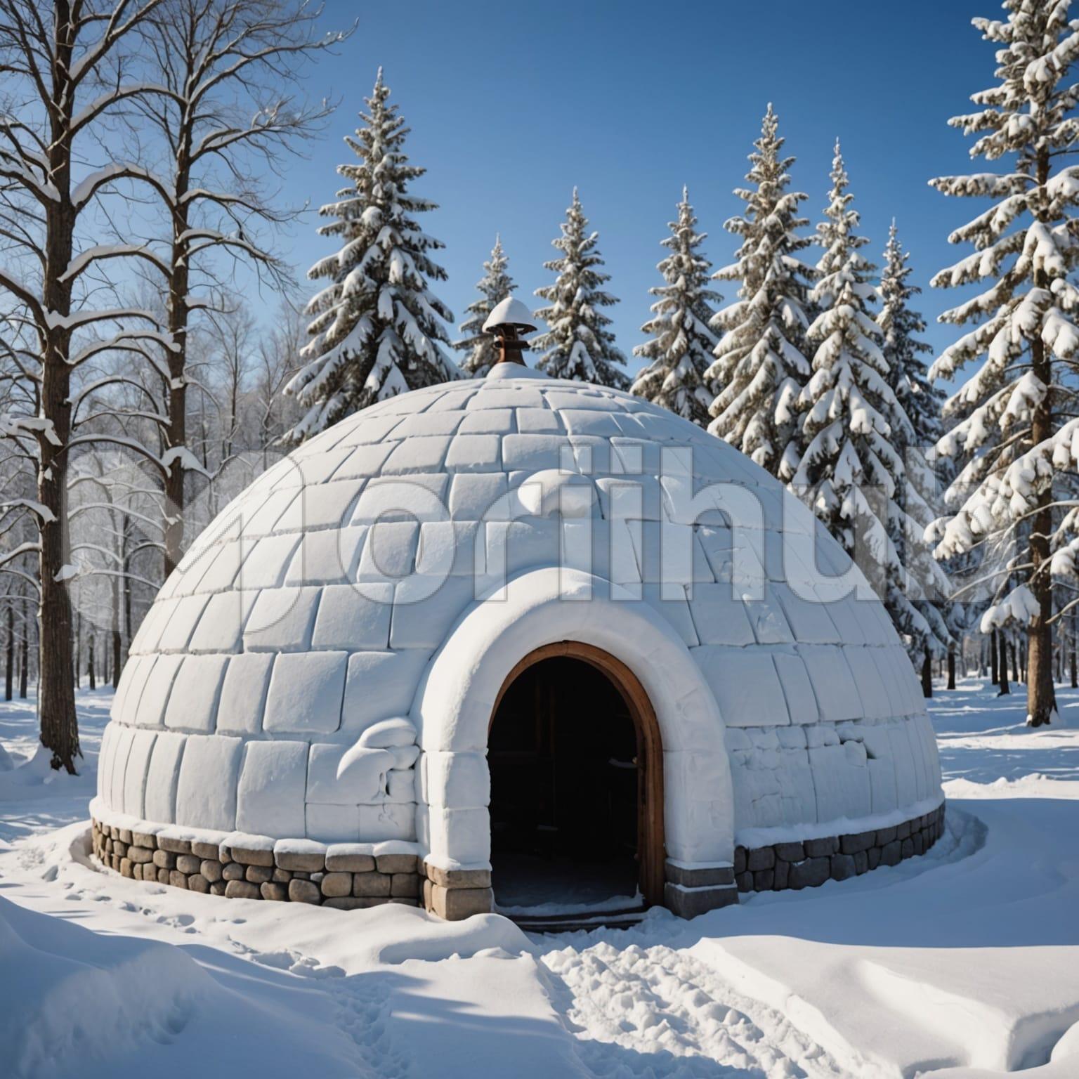 An igloo stands alone on snowy terrain, its rounded form built from compact blocks of snow. The surface appears smooth, shaped with care, resting quietly in the open space. Behind it, a line of trees rises, their branches lightly dusted with snow, adding soft detail to the scene. The ground stretches wide and untouched, showing no signs of paths or footprints. The air feels still, and no movement disturbs the view. The simple scene stays quiet and calm, defined by the steady shape of the igloo and the soft presence of distant snow-covered trees.