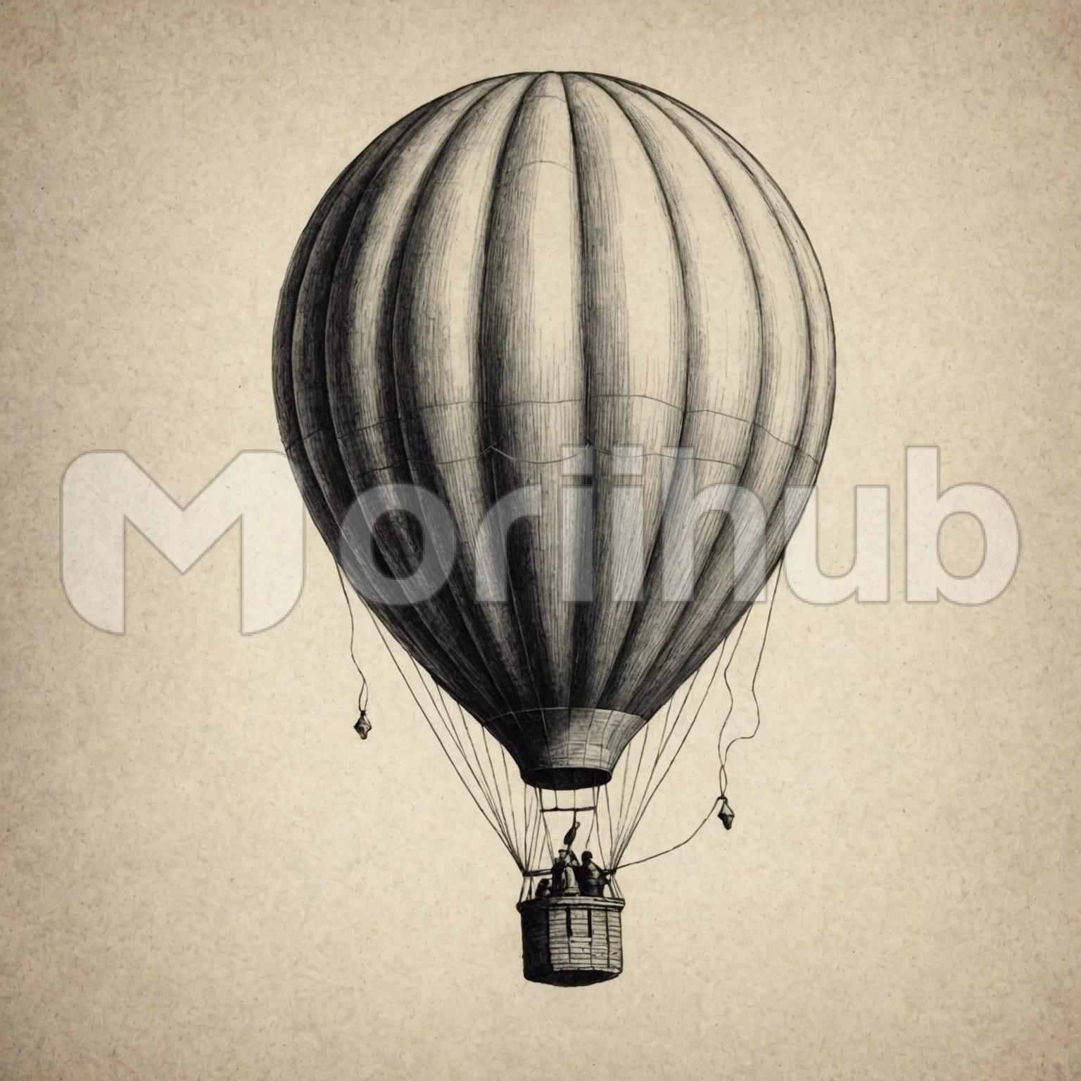 A sketch of a hot air balloon captures a sense of adventure and whimsy with delicate pencil strokes. The balloon itself, large and round, dominates the scene. The basket, hanging beneath, is sketched with fine lines, showing its woven texture. Wisps of smoke rise from the burner, adding a dynamic touch. The sky around is lightly shaded, indicating a serene, open expanse. The overall composition evokes a sense of lightness and freedom, ready to soar into endless possibilities.
