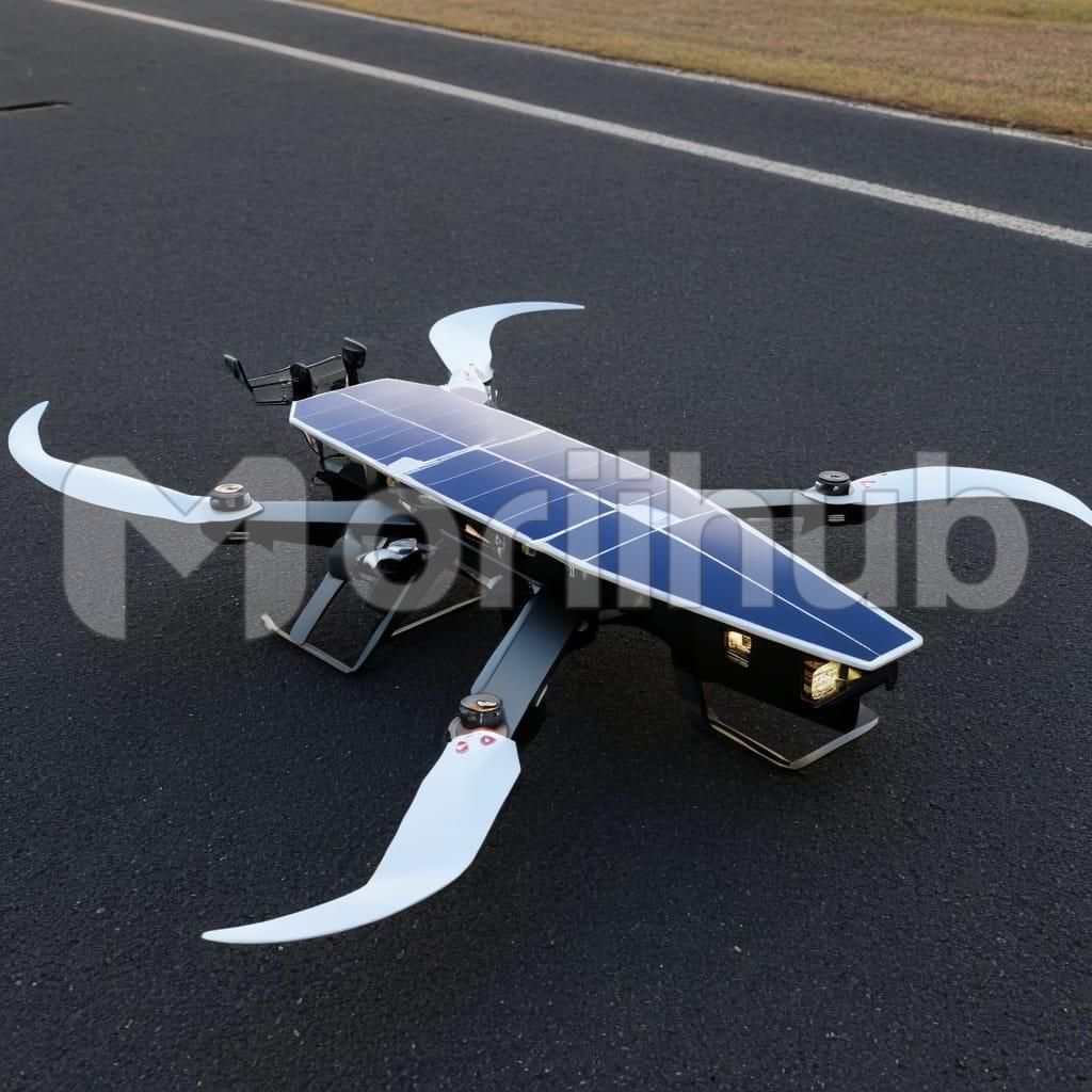 A modern solar drone soars effortlessly, powered by renewable energy. With sleek, aerodynamic design and solar panels integrated into its frame, it captures sunlight to fuel its flight, offering longer missions with minimal environmental impact. Ideal for surveillance, environmental monitoring, or delivery, the drone showcases the future of sustainable aviation, blending cutting-edge technology with eco-conscious innovation.