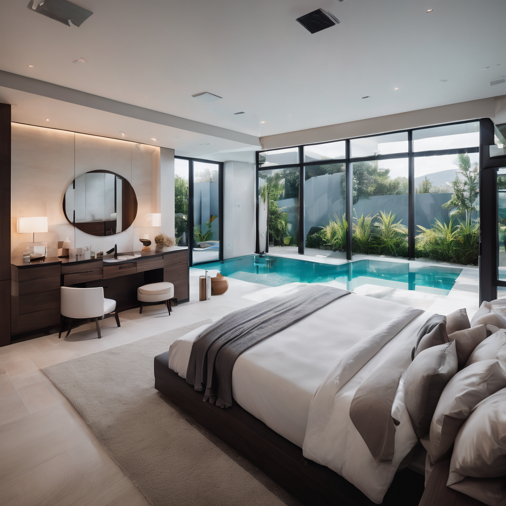 In the serene bedroom, a neatly arranged bed beckons with an abundance of plush pillows, promising restful slumber. A round mirror adorns the wall by the dresser, reflecting the tranquil ambiance. Nearby, petite chairs offer cozy seating options for contemplation or conversation. Through the glass door, lush greenery whispers of nature’s tranquility, inviting the outside world in. Here, comfort and natural beauty converge, creating a peaceful retreat from the hustle and bustle of daily life.