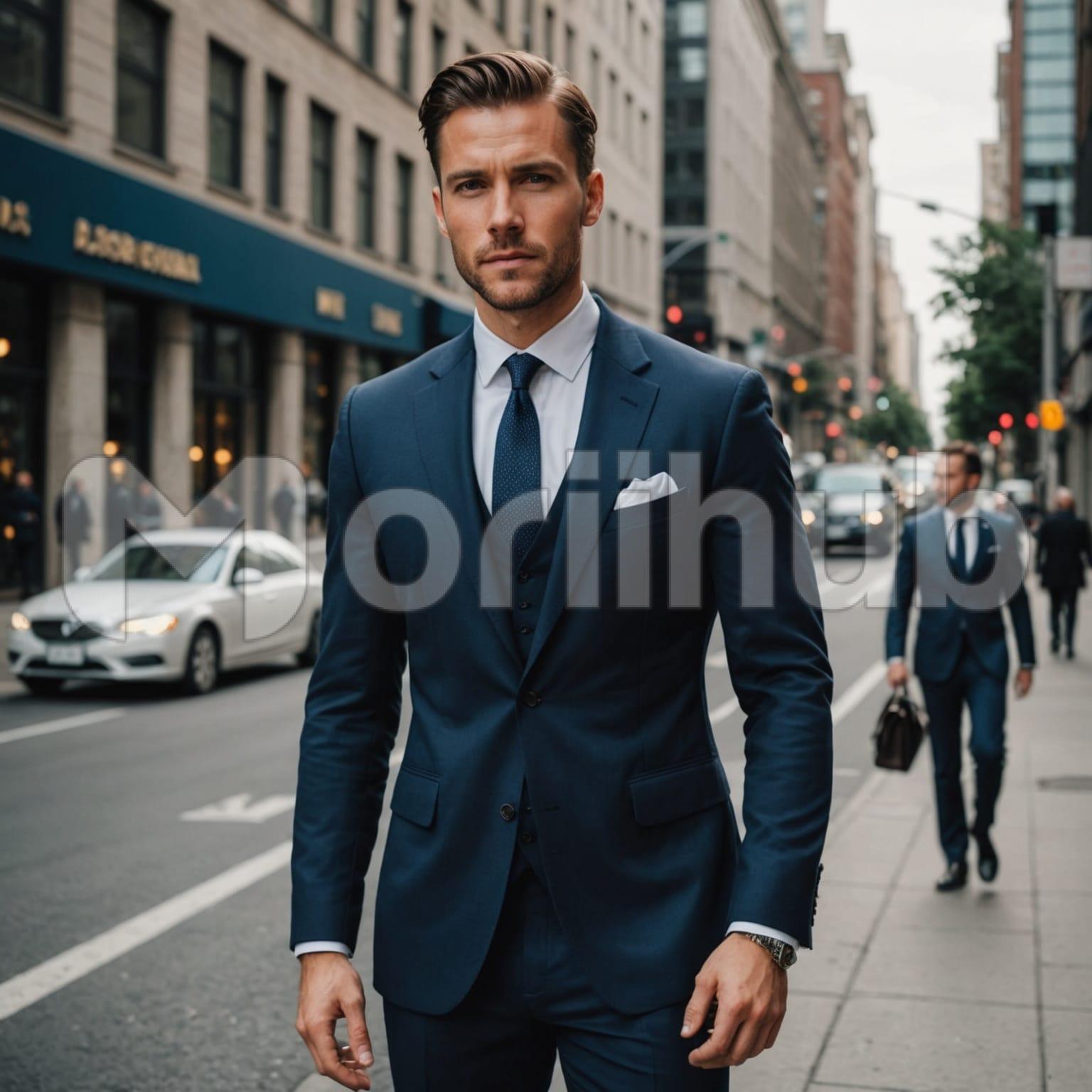 A man stands on the street in a tailored suit, the cut sharp and precise, emphasizing his refined style. His posture is composed, projecting calm assurance without effort. The suit carries a quiet elegance, each detail speaking of care and intention. Behind him, people are visible, their movements adding life to the backdrop yet never taking focus away. He remains distinct in the scene, marked by poise and presence. His look reflects timeless sophistication, a figure defined by elegance in a setting of everyday motion.