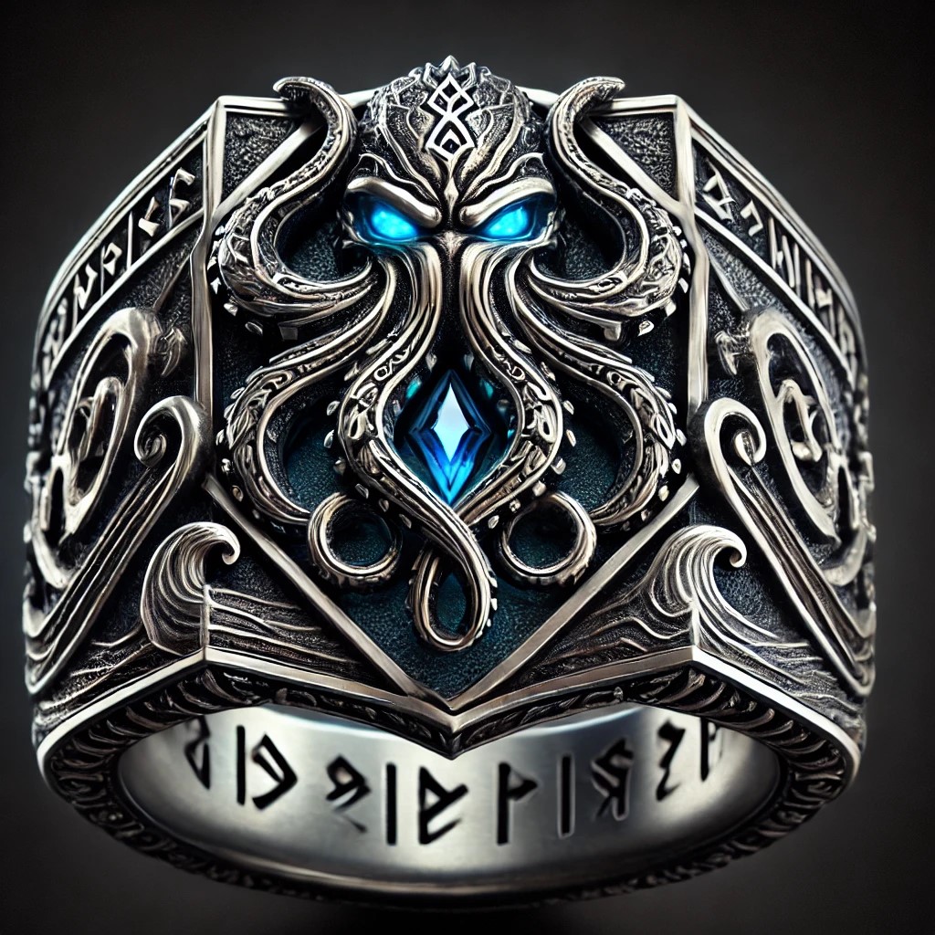 The Soul Kraken Ring is a bold and mysterious symbol of the Kraken’s legendary power, mystery, and deep connection to the soul. Crafted from dark metals, the ring showcases a detailed Kraken with its tentacles wrapping around the band. Its glowing blue gemstone eyes represent the Kraken’s ancient strength and its role as a guardian of the deep. The band is adorned with intricate wave-like patterns and ancient runes, symbolizing the Kraken’s link to fate and its position as a protector of the ocean’s mysteries.