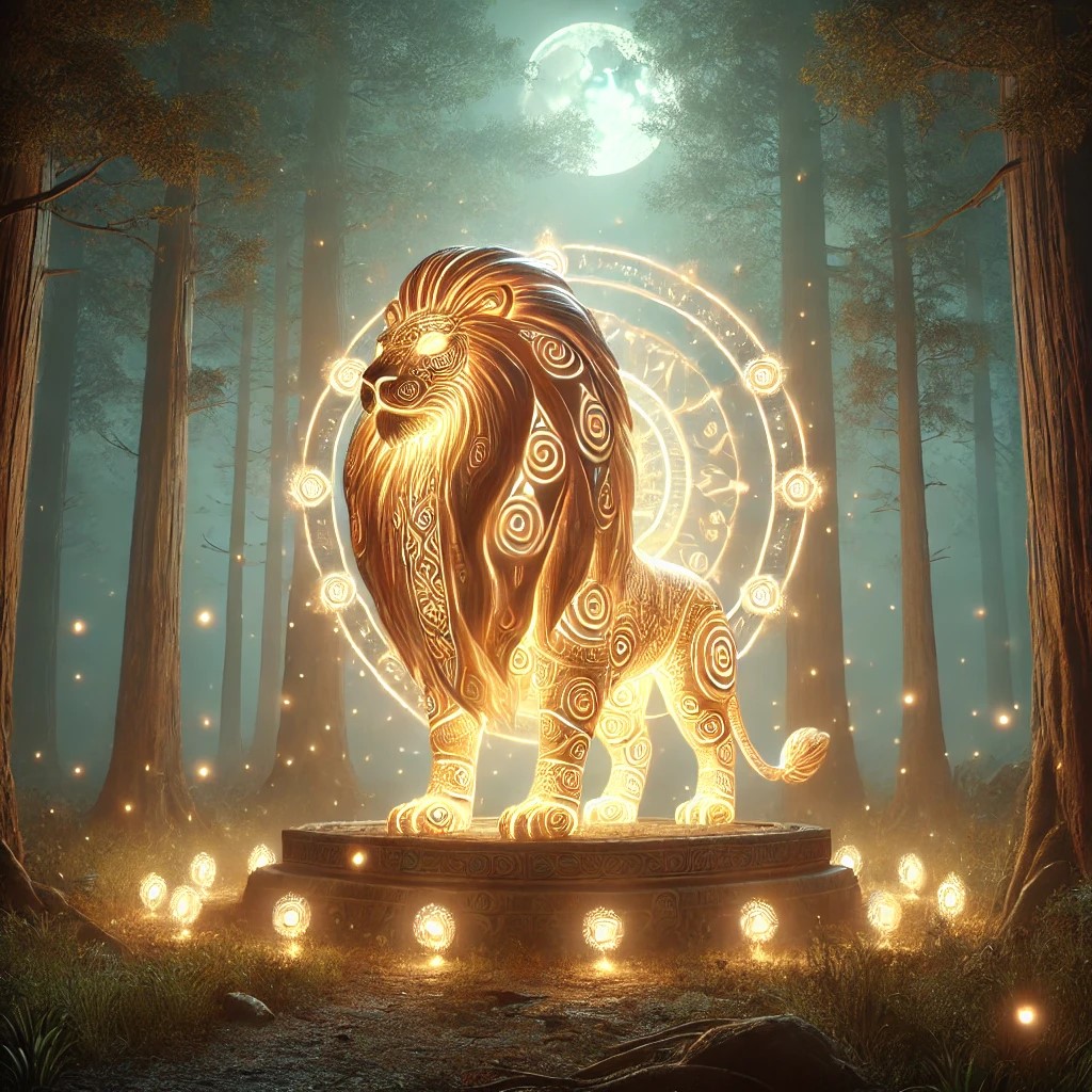 The lion spirit glows with a golden light, surrounded by the serene beauty of nature and mystical elements.