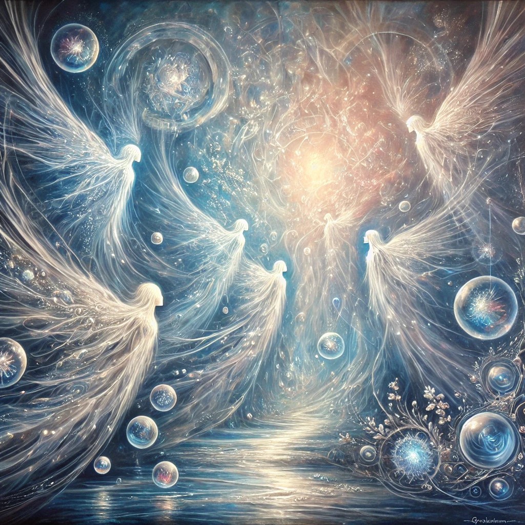 The painting depicts an ethereal scene where glowing, translucent orbs and wisps of light represent souls moving through a mystical realm. The colors are soft and luminous, with shades of blue, white, and silver dominating the palette, creating a serene and otherworldly atmosphere. The souls appear almost alive, gently swirling and drifting as if they are on a journey through the afterlife. Subtle symbols of life and death, such as flowers and feathers, are woven into the scene, adding depth and meaning.