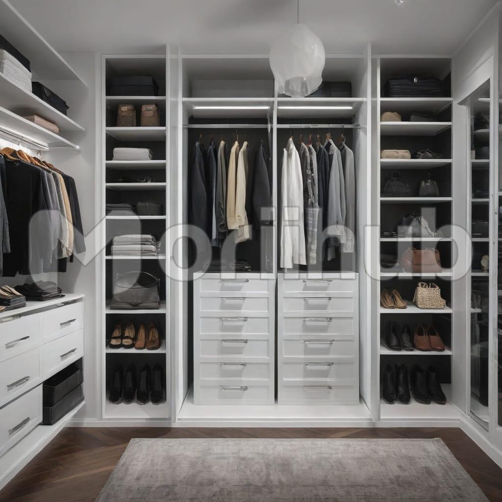 A pure white modern closet filled with clothes offers a clean, fresh aesthetic while maintaining a sense of order. The minimalist design highlights the spacious shelves and sleek drawers, perfectly organizing a variety of garments. This elegant closet seamlessly blends style and practicality, creating a bright and airy atmosphere that showcases both beauty and functionality.
