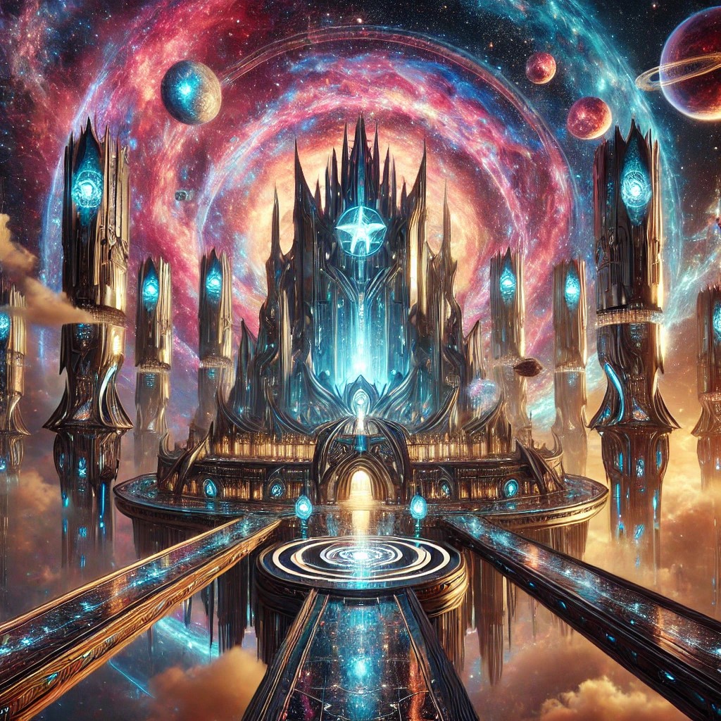 The Space Warrior Academy floats majestically in the vastness of outer space, surrounded by swirling galaxies, distant stars, and vibrant nebulae. The academy is a futuristic structure made of sleek, reflective materials that shimmer with the colors of the cosmos. The walls are adorned with intricate cosmic patterns and glowing runes that pulse with energy. The academy’s towers rise high, resembling spacecraft ready to launch, and are connected by bridges of light that seem to defy gravity.