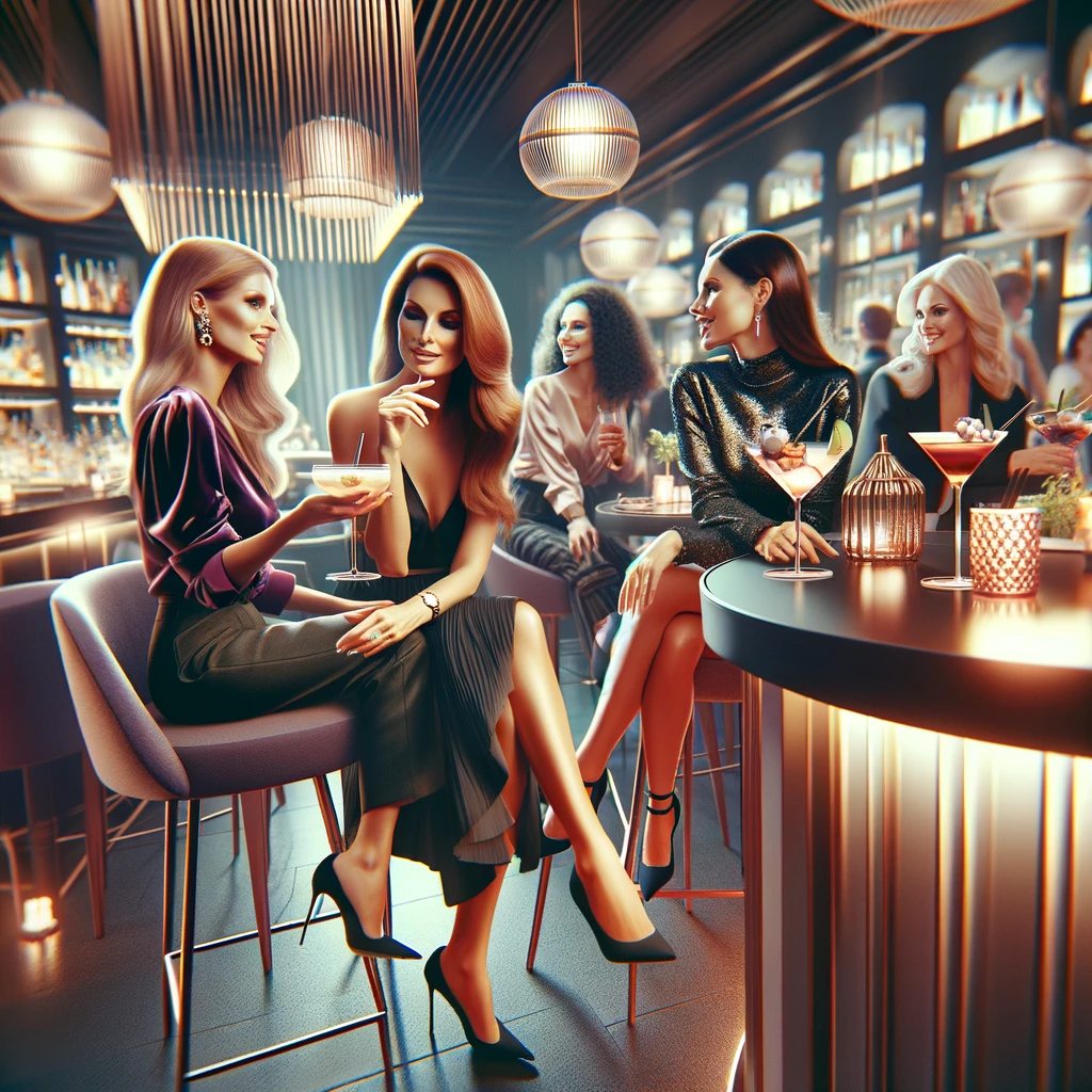 Step into a stylish and sophisticated scene at an upscale bar, where the atmosphere is alive with energy and vibrancy. Elegantly dressed ladies gather, their laughter and chatter filling the air with excitement. Cocktails glisten under the ambient lighting, expertly crafted by the skilled bartenders. The ambiance is chic and luxurious, the perfect setting for a night of revelry and glamour.