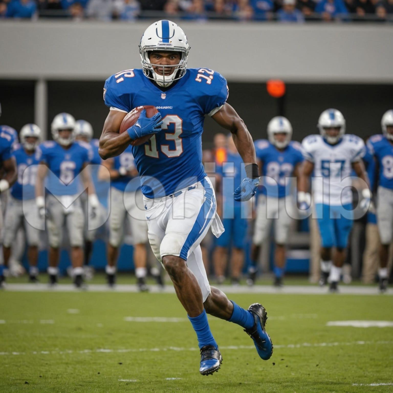 An American football player dashes across the open field, gripping the football tightly, his body angled with determination as he pushes forward. His uniform is marked by effort, every stride purposeful, reflecting speed and focus. The field beneath him stretches wide, lines guiding his path as he advances. On the sidelines, teammates and opponents stand observing, their attention fixed on his movement. Some watch with anticipation, others with calculation, gauging the play as it unfolds. The moment captures intensity, drive, and athletic determination.