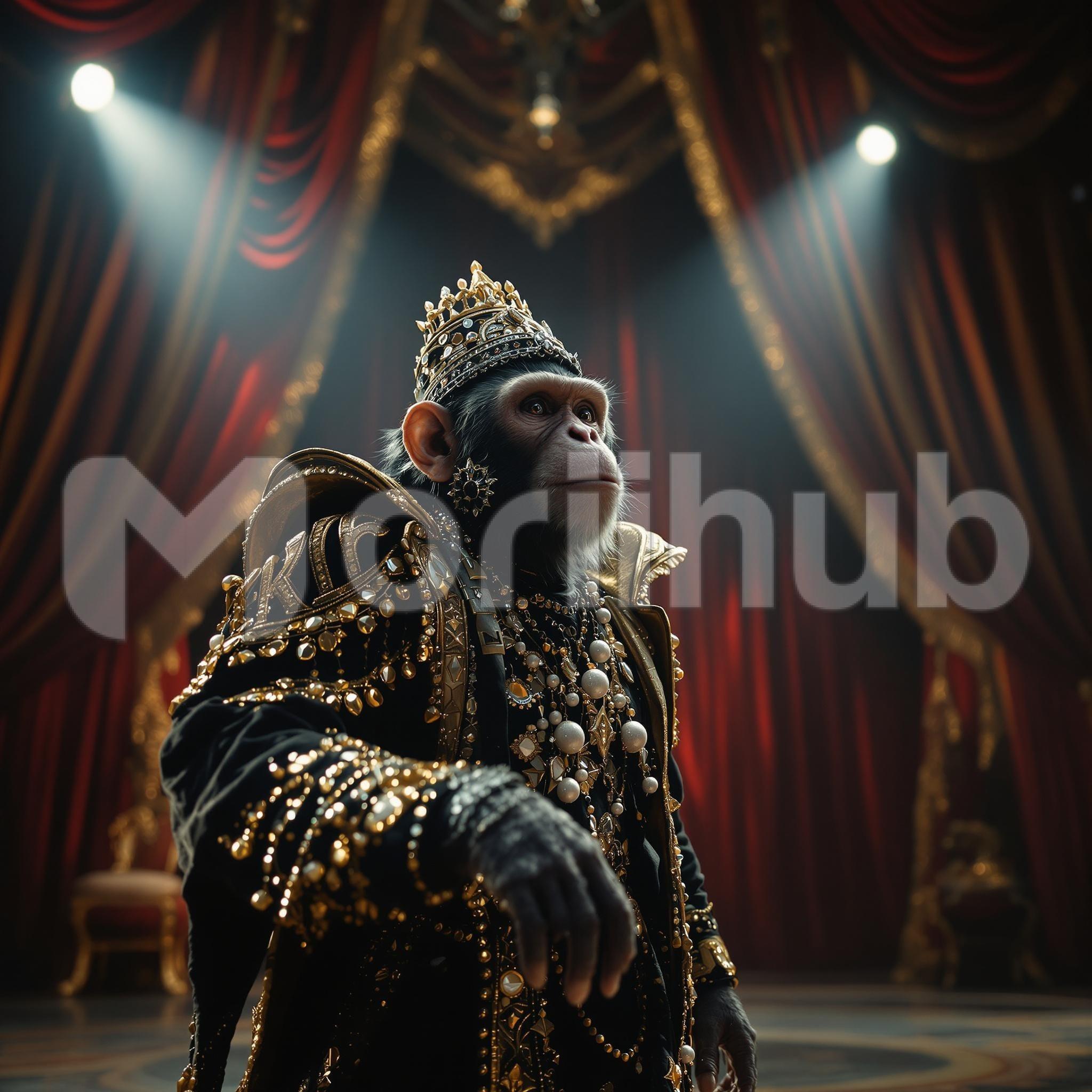 A lively monkey stands confidently under the spotlight, poised to take the stage. With a playful grin and arms spread wide, it exudes energy and charisma. Dressed in a tiny vest and hat, the monkey radiates charm, ready to perform. The stage lights cast a golden glow, enhancing the excitement in the air. Whether for a circus act, talent show, or playful performance, this spirited primate is set to steal the show with enthusiasm and flair.