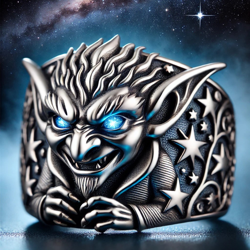 The “Starlight Goblin Ring” is a captivating silver ring that features a sly and mischievous goblin. Its pointed ears, sharp teeth, and wiry body are adorned with intricate starlight patterns that glow with a soft blue light, enhancing the goblin’s cunning and mystical nature. The band is engraved with stars and galaxies, creating a celestial theme.