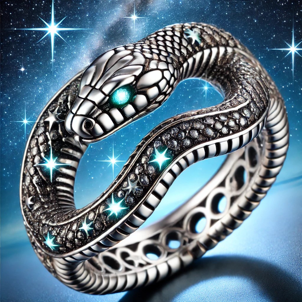 The “Starlight Snake Ring” is an elegant silver ring featuring a coiled snake, with intricate starlight patterns carved into its shimmering scales. The snake’s eyes glow with a soft, magical blue light, and its body wraps gracefully around the band, creating a fluid and dynamic design. The ring’s band is adorned with small stars and galaxies, enhancing its celestial theme. The snake’s scales softly glow, adding to its otherworldly presence.