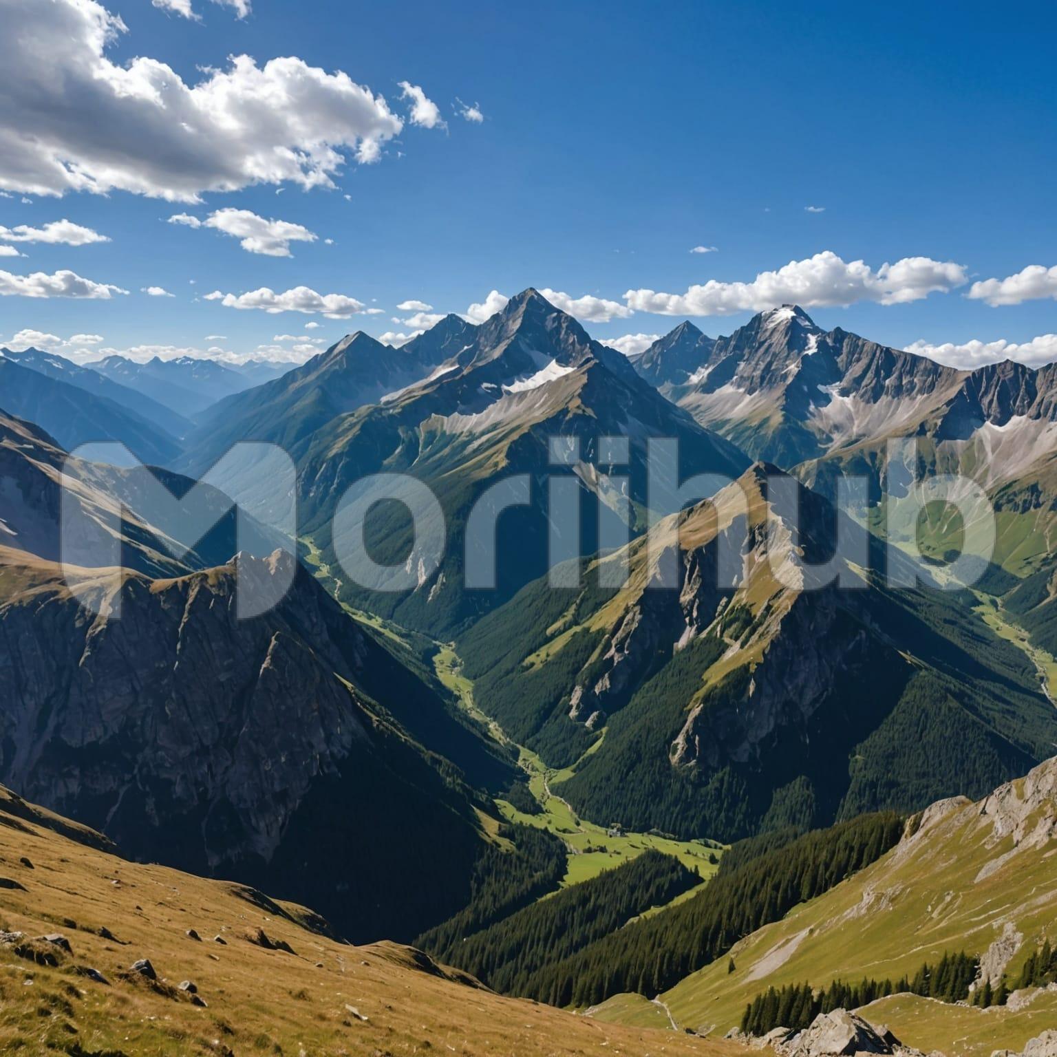 Mountains stretch ahead, their forms uneven and firm, rising in quiet succession. The ridgelines appear distinct, each one catching light and shadow differently. Clouds drift across the upper sky, some gathering loosely near the peaks, while others move higher, leaving open space between. The atmosphere feels calm but expansive, with no rush in the air or on the land. The mountains hold their shape without motion, settled into the distance. Nothing interrupts the view—just the meeting of rock and sky, grounded below and open above in a steady, measured scene.