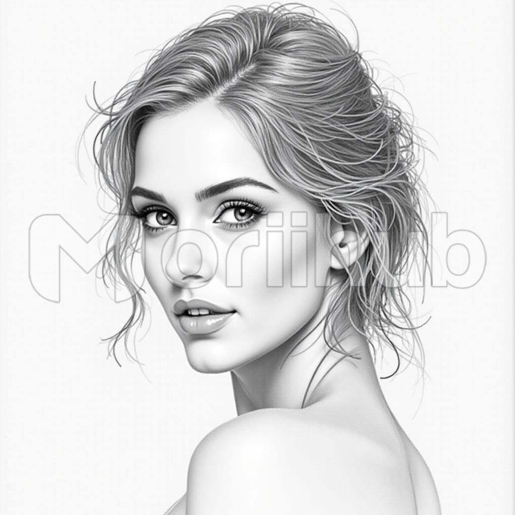The sketch portrays a woman with delicate features, her gaze directed forward. Soft lines shape her face, highlighting the curve of her cheekbones and the gentle arch of her brows. Her short hair is drawn with fine strokes, adding texture and movement. Shading brings depth, accentuating the contours of her face. Her expression is calm, captured with subtle details. The plain background keeps the focus on her features, emphasizing the simplicity of the composition. Every line is carefully placed, creating a striking yet understated portrait.