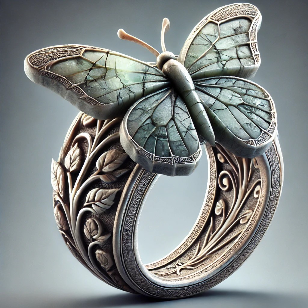 The “Stone Butterfly Ring” displays a delicately carved butterfly perched gracefully on the band with its wings spread wide. The wings are etched with fine cracks and intricate ancient patterns, giving the butterfly a timeless, mystical quality. A faint glow emanates from both the wings and body, hinting at hidden magic within. The band is adorned with intricate stone-like patterns, complemented by subtle vines and roots that weave through the design.