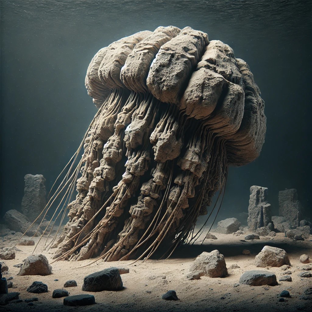 A grounded, solid scene featuring a stone jellyfish that embodies the essence of stone. The jellyfish has a rough, textured body resembling carved stone or weathered rock, with shades of gray, brown, and earthy tones. Its tendrils appear like jagged stone formations, trailing behind it as it drifts slowly through a dark underwater environment. The water around it is filled with scattered rocks and ancient ruins, creating a sense of timelessness and strength.