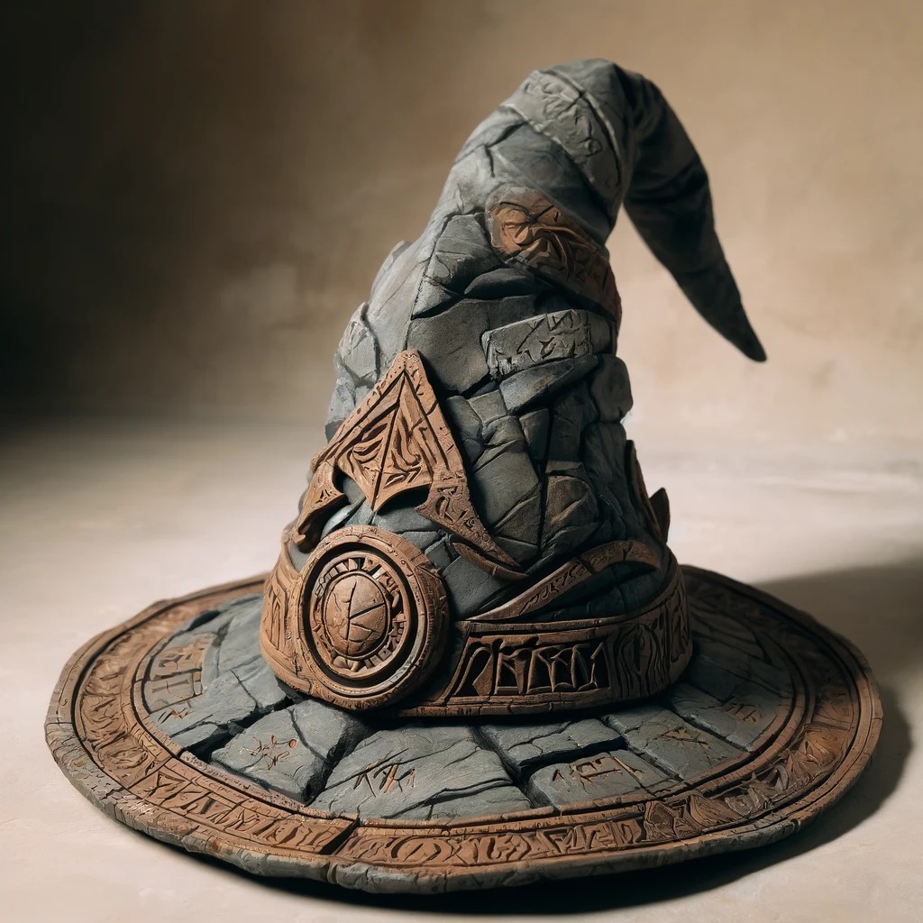 This hat has a solid, earthy design, resembling a piece of ancient, carved stone. The hat features textures like rough rock and cracks, with patterns reminiscent of ancient runes or glyphs etched into its surface. The colors are earthy and muted, with shades of gray, brown, and hints of mossy green. The hat appears as if it’s heavy and enduring, with a strong, grounded presence.
