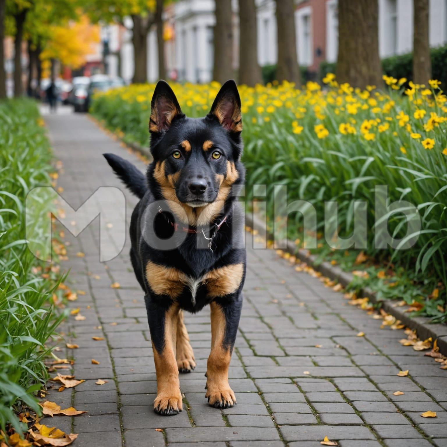 A dog walks along a path of interlocked stones, each step steady and full of energy. Its paws move with a rhythmic grace, creating a soft tapping sound as they meet the textured surface. The dog’s eyes are bright and curious, glancing around with interest as it explores its surroundings. Its tail wags gently, reflecting a relaxed and happy demeanor. The interlocked stones underfoot provide a sturdy pathway, enhancing the scenic walk. This moment captures the dog’s joyful spirit and enthusiasm as it strolls confidently on its little adventure.