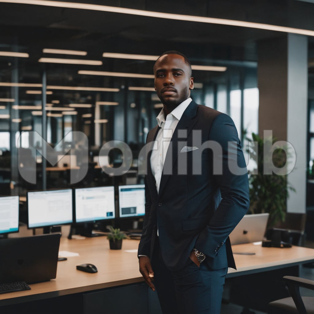 Dressed impeccably in a sharp black suit, a confident black man stands in a modern office. His hand casually tucked in his pocket exudes an air of assurance. Amidst a backdrop of sleek workstations, multiple computers hum with activity, reflecting his professional environment. With poise and purpose, he embodies a poised and professional presence in the bustling office setting.