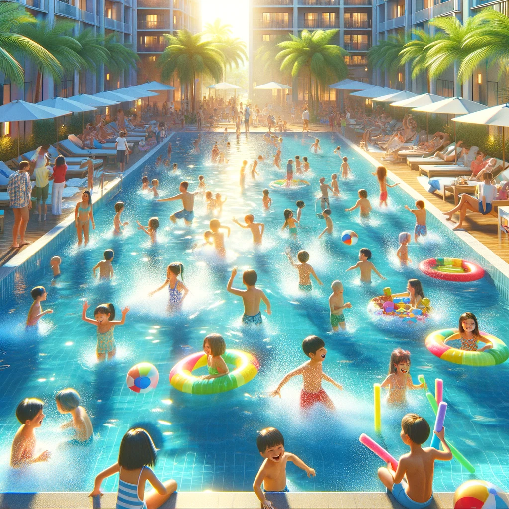 Under the golden sun of a bright summer day, the pool becomes a playground of joy. Children’s laughter fills the air as they splash and play, their faces illuminated with delight. The water sparkles with every joyful leap, echoing the exuberance of their spirits. It’s a scene of pure happiness and carefree fun, where memories are made amidst the warmth of summer’s embrace.